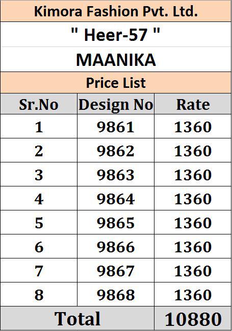 Brand - Kimora . Catlog name - MAANIKA. Heer Vol -57. Set To Set . GST 5 Percent Extra. Delivery from 4-5 days |