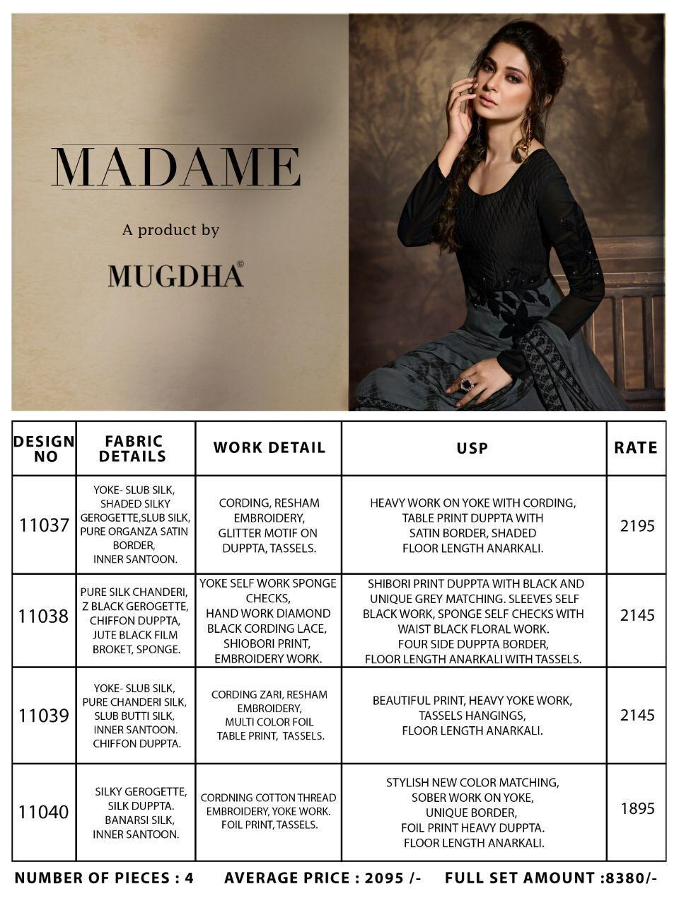 Buy Online Madame By Mugdha Series 11037 To 11040 Designer Party Wear Suits Wholesaler Surat 4 Pcs of Full Catalogue at Wholesale Price. Looking for Madame By Mugdha Series 11037 To 11040 Designer Party Wear Suits Wholesaler Surat Full Catalouge at Best Price? Buy Now Madame By Mugdha Series 11037 To 11040 Designer Party Wear Suits Wholesaler Surat at Wholesale Rate of Rs 8380 with Total 4 Pcs from authroized dealer and supplier of MUGDHA Brand. Cost of Each piece is just only Rs 2095 which is very low and affordable price to resale the product in your retail store ,This is Surat based Wholesale Supplier & Dealer of MUGDHA Brand. Click on Brand name to Know more about MUGDHA Brand's products.Call or Whatsapp on 9898838984 for booking or enquiry