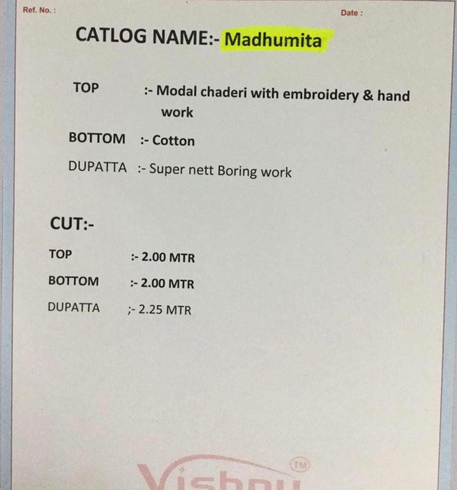 Brand - Vishnu Impex. Catlog name -MADHUMITA. Rate -650 per pcs . Set To Set. GST 5 Percent Extra. Delivery 2 days |
