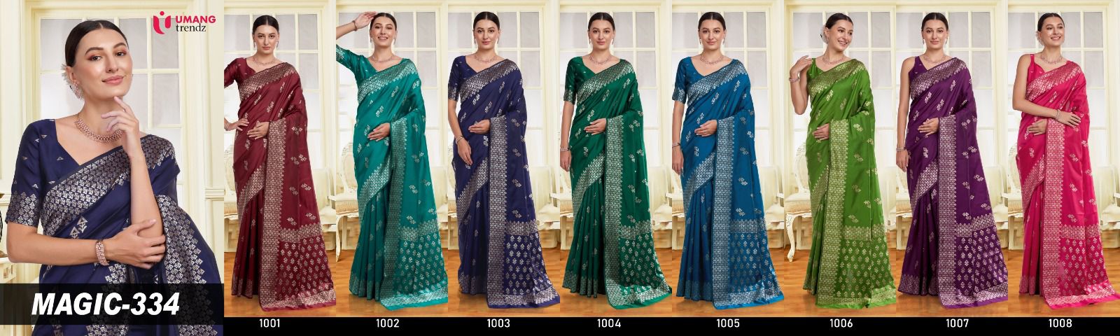 UMANG TRENDZ(FIRM OF KL ENTERPRISES) PRESENTS Catalog Name :? *MAGIC 334* No of Pcs : *8* Fabric : *LICHI KOTA SILK* Packing : Premium Pouch Bag Rate : 545/- Gst extra 5% GST Regards UMANG TRENDZ? 100+single |
