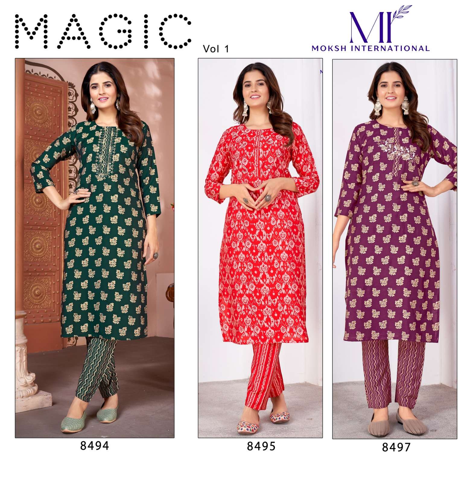 Buy Online Magic Vol 1 by Moksh International Royal Silk kurti collection manufacturer surat 3 Pcs of Full Catalogue at Wholesale Price. Looking for Magic Vol 1 by Moksh International Royal Silk kurti collection manufacturer surat Full Catalouge at Best Price? Buy Now Magic Vol 1 by Moksh International Royal Silk kurti collection manufacturer surat at Wholesale Rate of Rs 2685 with Total 3 Pcs from authroized dealer and supplier of MOKSH INTERNATIONAL Brand. Cost of Each piece is just only Rs 895 which is very low and affordable price to resale the product in your retail store ,This is Surat based Wholesale Supplier & Dealer of MOKSH INTERNATIONAL Brand. Click on Brand name to Know more about MOKSH INTERNATIONAL Brand's products.Call or Whatsapp on 9898838984 for booking or enquiry