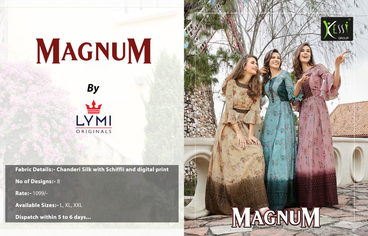 ? *LYMI (Kessi Fabrics Pvt. Ltd.)* has launched _Catalog name_ : *Magnum* ? _Fabric Details_ ? ?Top:- Chanderi Silk with Schiffli and Digital Print ?Total Design :- 8 ?Size;- L, XL, XXL ?Dispatching 5 to 6 days later Rate : 1099/- Gst extra |