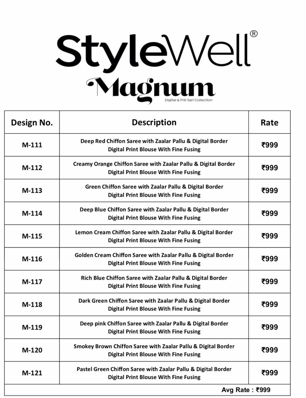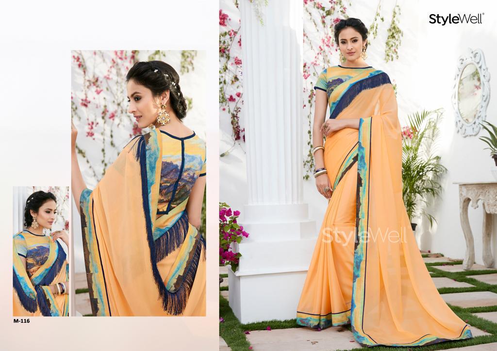Buy Online Magnum By Style Well Series M 111 To M 121 Chiffon Digital Printed Sarees Wholesale Supplier Surat 11 Pcs of Full Catalogue at Wholesale Price. Looking for Magnum By Style Well Series M 111 To M 121 Chiffon Digital Printed Sarees Wholesale Supplier Surat Full Catalouge at Best Price? Buy Now Magnum By Style Well Series M 111 To M 121 Chiffon Digital Printed Sarees Wholesale Supplier Surat at Wholesale Rate of Rs 10989 with Total 11 Pcs from authroized dealer and supplier of STYLE WELL Brand. Cost of Each piece is just only Rs 999 which is very low and affordable price to resale the product in your retail store ,This is Surat based Wholesale Supplier & Dealer of STYLE WELL Brand. Click on Brand name to Know more about STYLE WELL Brand's products.Call or Whatsapp on 9898838984 for booking or enquiry