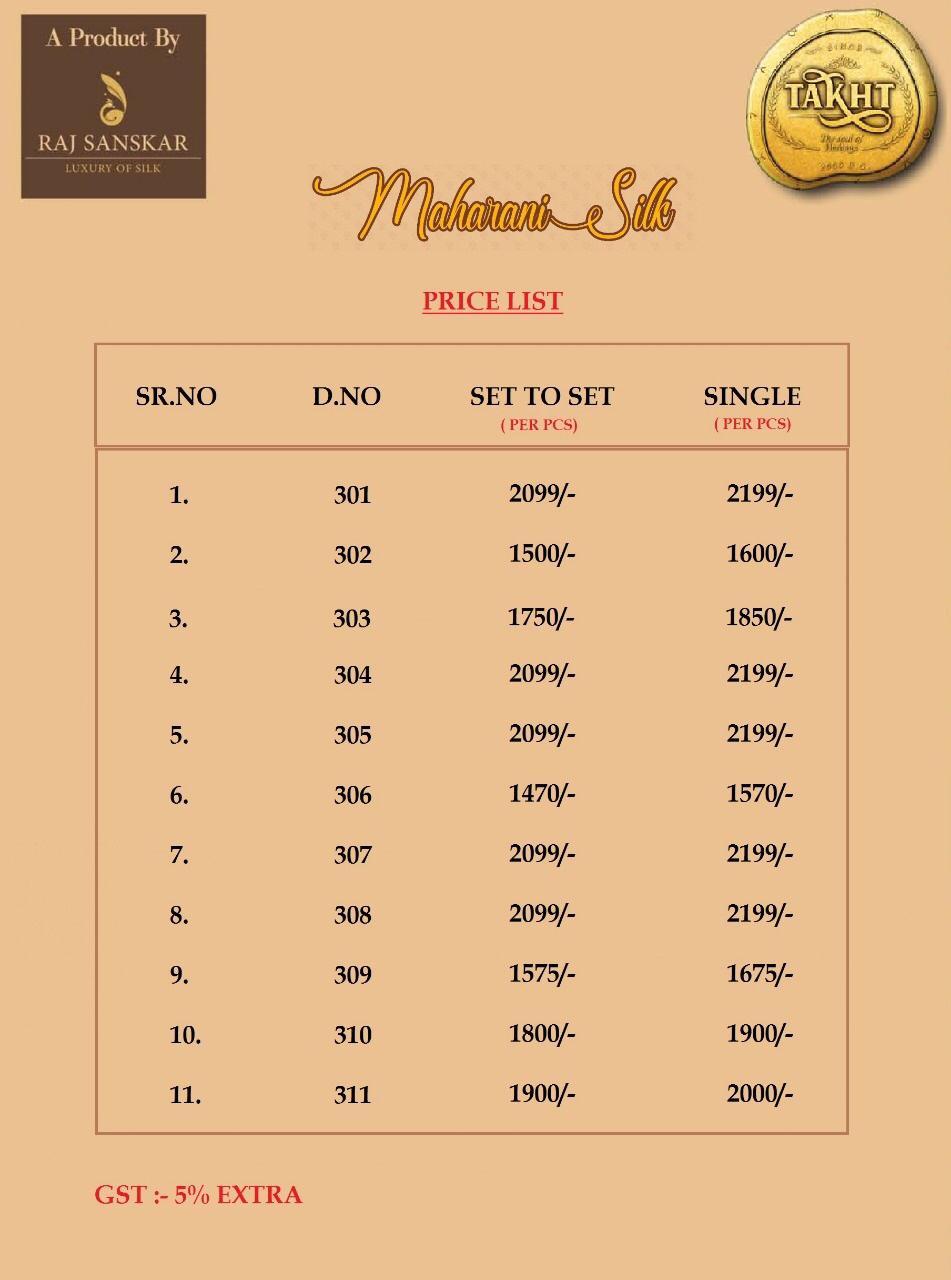 Brand - Raj Sanskar . Catlog name -MAHARANI SILK 301 to 311. GST 5 Percent Extra. Delivery 3-4 days Gst ship extra Single available |