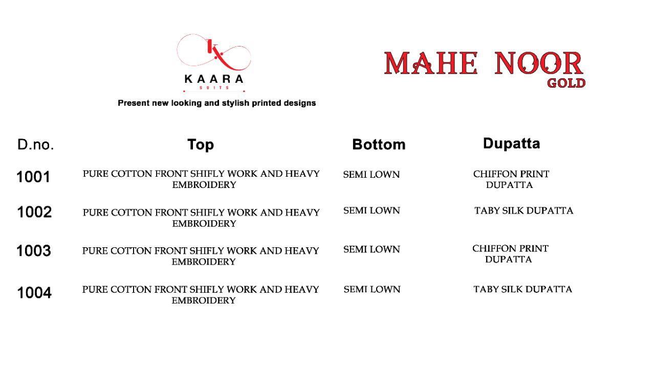 Buy Online Mahe Noor Gold By Kaara Suits Manufacturer Traders Surat 4 Pcs of Full Catalogue at Wholesale Price. Looking for Mahe Noor Gold By Kaara Suits Manufacturer Traders Surat Full Catalouge at Best Price? Buy Now Mahe Noor Gold By Kaara Suits Manufacturer Traders Surat at Wholesale Rate of Rs 4596 with Total 4 Pcs from authroized dealer and supplier of KAARA Brand. Cost of Each piece is just only Rs 1149 which is very low and affordable price to resale the product in your retail store ,This is Surat based Wholesale Supplier & Dealer of KAARA Brand. Click on Brand name to Know more about KAARA Brand's products.Call or Whatsapp on 9898838984 for booking or enquiry