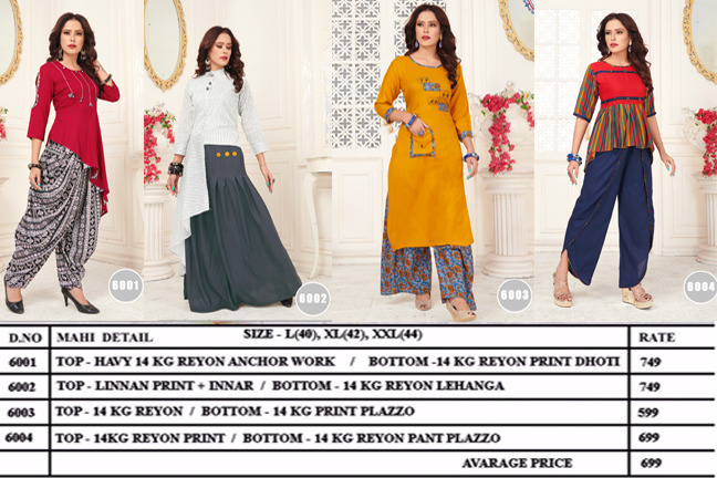 Buy Online Mahi By Elina Kurti With Bottom Collection Supplier And Dealer Gujarat 4 Pcs of Full Catalogue at Wholesale Price. Looking for Mahi By Elina Kurti With Bottom Collection Supplier And Dealer Gujarat Full Catalouge at Best Price? Buy Now Mahi By Elina Kurti With Bottom Collection Supplier And Dealer Gujarat at Wholesale Rate of Rs 2796 with Total 4 Pcs from authroized dealer and supplier of Brand. Cost of Each piece is just only Rs 699 which is very low and affordable price to resale the product in your retail store ,This is Surat based Wholesale Supplier & Dealer of Brand. Click on Brand name to Know more about Brand's products.Call or Whatsapp on 9898838984 for booking or enquiry