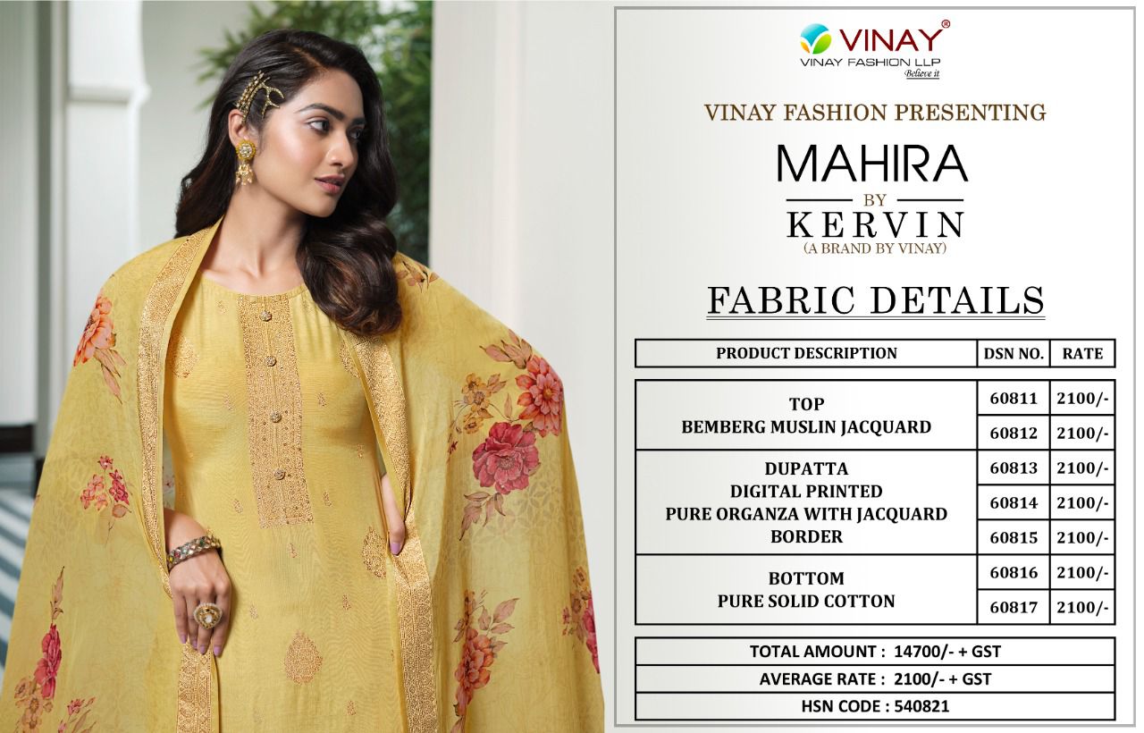 Buy Online Mahira By Kervin Vinay Fashion Designer Suits Wholesale Suppliers And Dealer From India 7 Pcs of Full Catalogue at Wholesale Price. Looking for Mahira By Kervin Vinay Fashion Designer Suits Wholesale Suppliers And Dealer From India Full Catalouge at Best Price? Buy Now Mahira By Kervin Vinay Fashion Designer Suits Wholesale Suppliers And Dealer From India at Wholesale Rate of Rs 14700 with Total 7 Pcs from authroized dealer and supplier of Brand. Cost of Each piece is just only Rs 2100 which is very low and affordable price to resale the product in your retail store ,This is Surat based Wholesale Supplier & Dealer of Brand. Click on Brand name to Know more about Brand's products.Call or Whatsapp on 9898838984 for booking or enquiry
