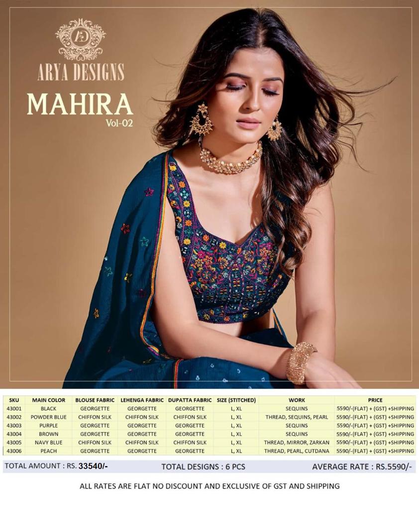 Buy Online Mahira Vol 2 By Arya Designs 6 Pcs of Full Catalogue at Wholesale Price. Looking for Mahira Vol 2 By Arya Designs Full Catalouge at Best Price? Buy Now Mahira Vol 2 By Arya Designs at Wholesale Rate of Rs 33540 with Total 6 Pcs from authroized dealer and supplier of Brand. Cost of Each piece is just only Rs 5590 which is very low and affordable price to resale the product in your retail store ,This is Surat based Wholesale Supplier & Dealer of Brand. Click on Brand name to Know more about Brand's products.Call or Whatsapp on 9898838984 for booking or enquiry