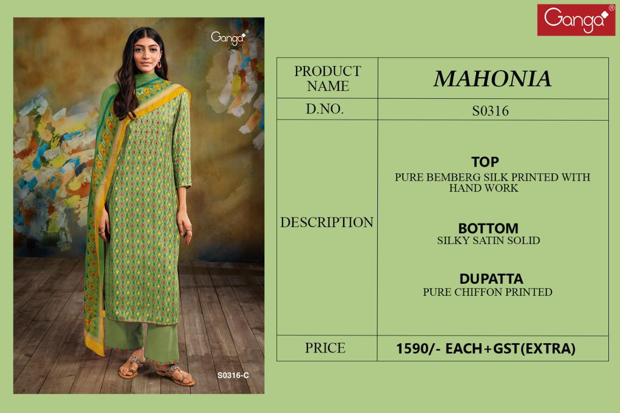 Buy Online Mahonia 316 By Ganga Dealer And Exporter Surat 4 Pcs of Full Catalogue at Wholesale Price. Looking for Mahonia 316 By Ganga Dealer And Exporter Surat Full Catalouge at Best Price? Buy Now Mahonia 316 By Ganga Dealer And Exporter Surat at Wholesale Rate of Rs 6360 with Total 4 Pcs from authroized dealer and supplier of GANGA Brand. Cost of Each piece is just only Rs 1590 which is very low and affordable price to resale the product in your retail store ,This is Surat based Wholesale Supplier & Dealer of GANGA Brand. Click on Brand name to Know more about GANGA Brand's products.Call or Whatsapp on 9898838984 for booking or enquiry