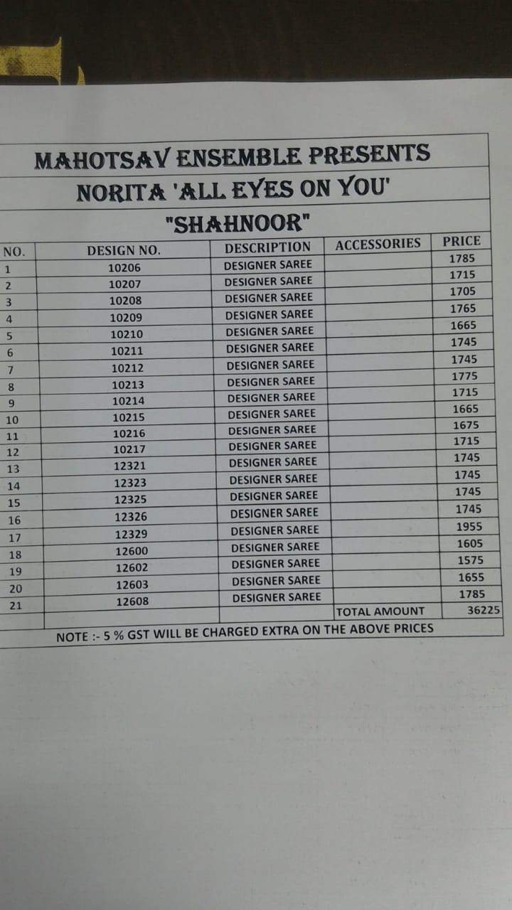 Buy Online Mahotsav Shahnoor 10206 Series Designer Party Wear Saree Catlog Wholesale Dealer And Supplier Surat 21 Pcs of Full Catalogue at Wholesale Price. Looking for Mahotsav Shahnoor 10206 Series Designer Party Wear Saree Catlog Wholesale Dealer And Supplier Surat Full Catalouge at Best Price? Buy Now Mahotsav Shahnoor 10206 Series Designer Party Wear Saree Catlog Wholesale Dealer And Supplier Surat at Wholesale Rate of Rs 36225 with Total 21 Pcs from authroized dealer and supplier of Mahotsav Saree Brand. Cost of Each piece is just only Rs 1725 which is very low and affordable price to resale the product in your retail store ,This is Surat based Wholesale Supplier & Dealer of Mahotsav Saree Brand. Click on Brand name to Know more about Mahotsav Saree Brand's products.Call or Whatsapp on 9898838984 for booking or enquiry