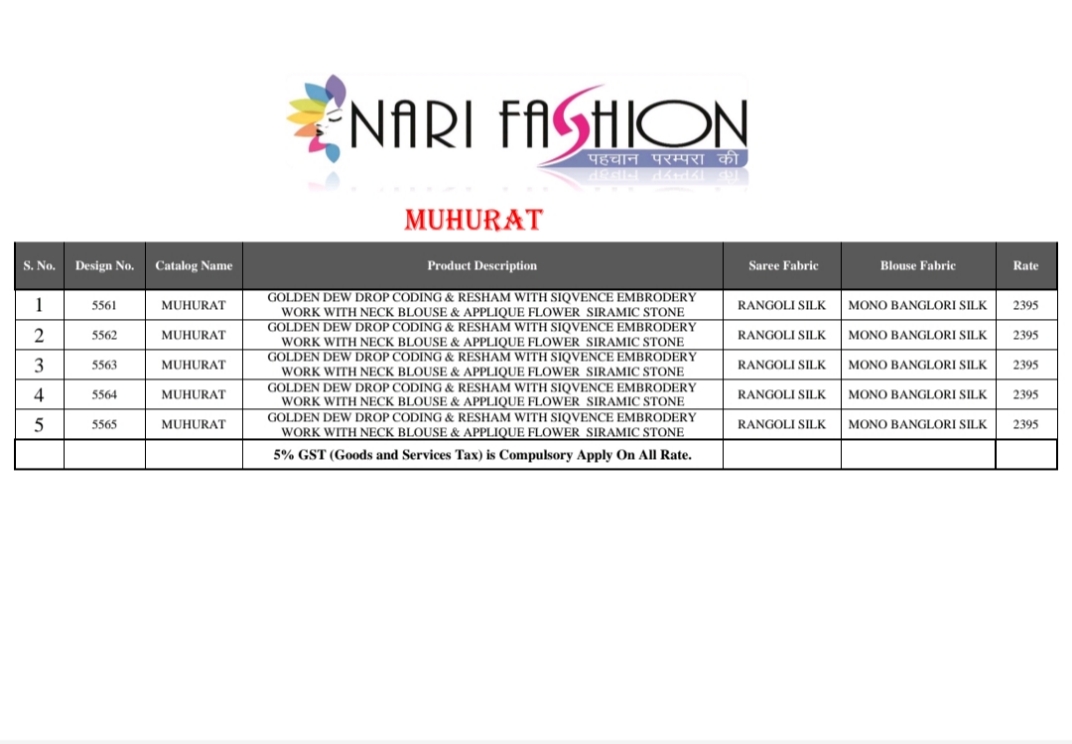 Nari fashion Mahurat Series 5561 to 5565 Single available Gst 5% Extra Book now 100+Single |