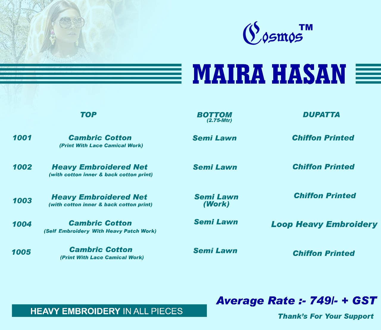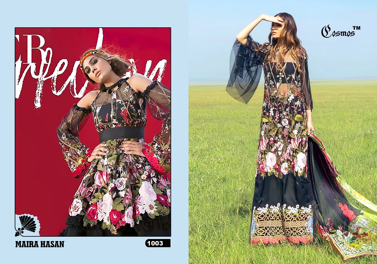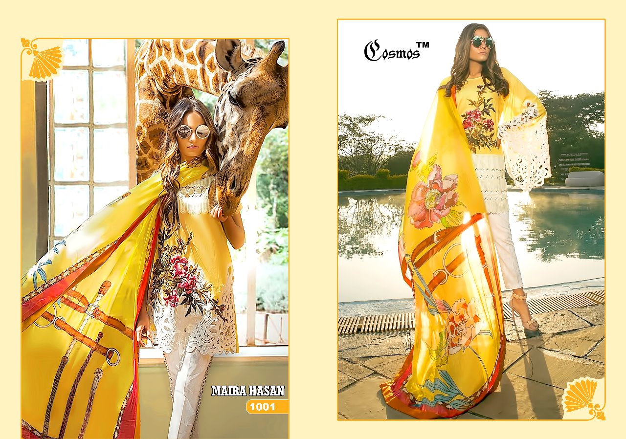 Buy Online Maira Hasan By Cosmos Series 1001 To 1005 Cambric Cotton Pakistani Salwaar Suits Wholesale Supplier And Dealer Gujarat 5 Pcs of Full Catalogue at Wholesale Price. Looking for Maira Hasan By Cosmos Series 1001 To 1005 Cambric Cotton Pakistani Salwaar Suits Wholesale Supplier And Dealer Gujarat Full Catalouge at Best Price? Buy Now Maira Hasan By Cosmos Series 1001 To 1005 Cambric Cotton Pakistani Salwaar Suits Wholesale Supplier And Dealer Gujarat at Wholesale Rate of Rs 3745 with Total 5 Pcs from authroized dealer and supplier of COSMOS Brand. Cost of Each piece is just only Rs 749 which is very low and affordable price to resale the product in your retail store ,This is Surat based Wholesale Supplier & Dealer of COSMOS Brand. Click on Brand name to Know more about COSMOS Brand's products.Call or Whatsapp on 9898838984 for booking or enquiry