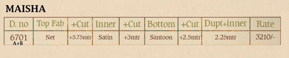 Buy Online Maisha 6701 Colours Designer Party Wear Suits Wholesale Supplier Gujarat 4 Pcs of Full Catalogue at Wholesale Price. Looking for Maisha 6701 Colours Designer Party Wear Suits Wholesale Supplier Gujarat Full Catalouge at Best Price? Buy Now Maisha 6701 Colours Designer Party Wear Suits Wholesale Supplier Gujarat at Wholesale Rate of Rs 12840 with Total 4 Pcs from authroized dealer and supplier of MAISHA Brand. Cost of Each piece is just only Rs 3210 which is very low and affordable price to resale the product in your retail store ,This is Surat based Wholesale Supplier & Dealer of MAISHA Brand. Click on Brand name to Know more about MAISHA Brand's products.Call or Whatsapp on 9898838984 for booking or enquiry