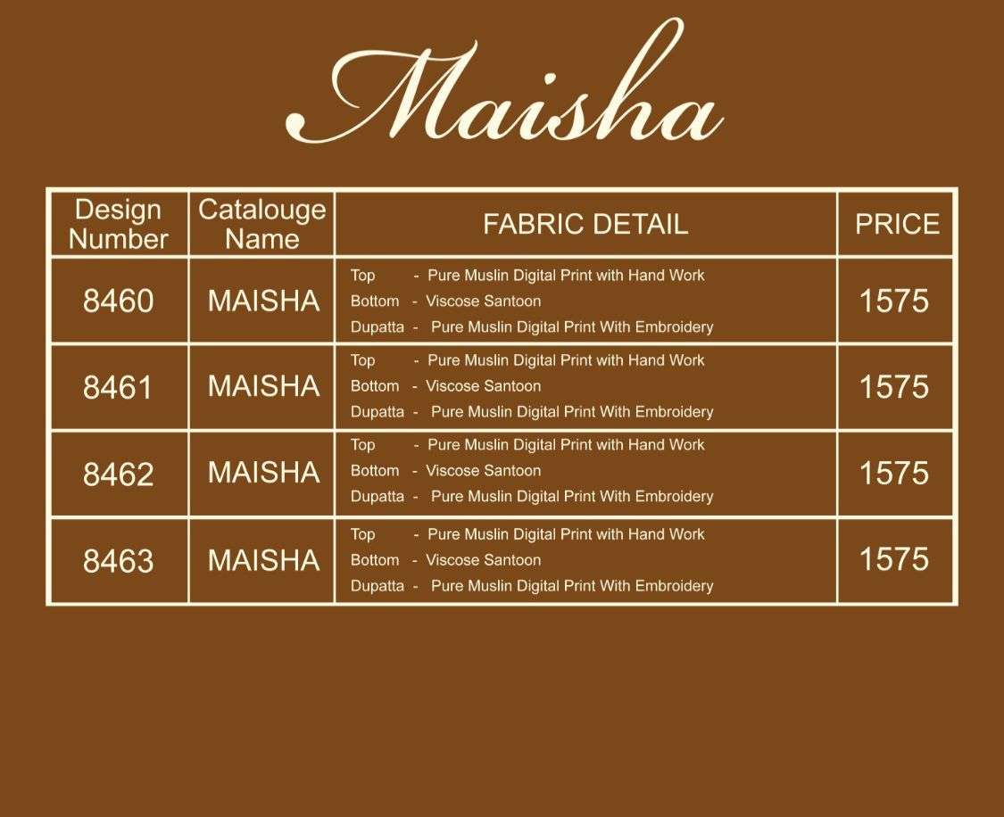Buy Online Maisha by bela suit collection manufacturers surat 4 Pcs of Full Catalogue at Wholesale Price. Looking for Maisha by bela suit collection manufacturers surat Full Catalouge at Best Price? Buy Now Maisha by bela suit collection manufacturers surat at Wholesale Rate of Rs 6300 with Total 4 Pcs from authroized dealer and supplier of BRAND'S Brand. Cost of Each piece is just only Rs 1575 which is very low and affordable price to resale the product in your retail store ,This is Surat based Wholesale Supplier & Dealer of BRAND'S Brand. Click on Brand name to Know more about BRAND'S Brand's products.Call or Whatsapp on 9898838984 for booking or enquiry