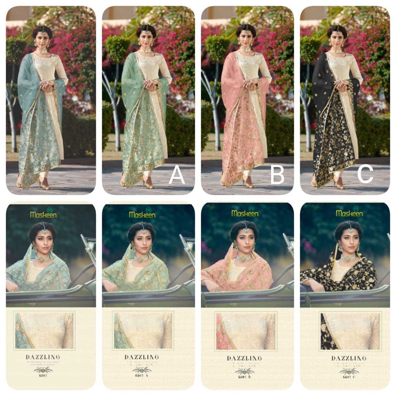 Buy Online Maisha Maskeen 6802 Colours Jaquard Designer Party Wear Suits Wholesale Supplier Gujarat 4 Pcs of Full Catalogue at Wholesale Price. Looking for Maisha Maskeen 6802 Colours Jaquard Designer Party Wear Suits Wholesale Supplier Gujarat Full Catalouge at Best Price? Buy Now Maisha Maskeen 6802 Colours Jaquard Designer Party Wear Suits Wholesale Supplier Gujarat at Wholesale Rate of Rs 8920 with Total 4 Pcs from authroized dealer and supplier of MAISHA Brand. Cost of Each piece is just only Rs 2230 which is very low and affordable price to resale the product in your retail store ,This is Surat based Wholesale Supplier & Dealer of MAISHA Brand. Click on Brand name to Know more about MAISHA Brand's products.Call or Whatsapp on 9898838984 for booking or enquiry