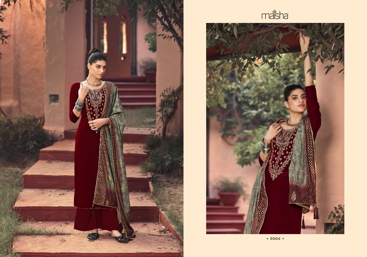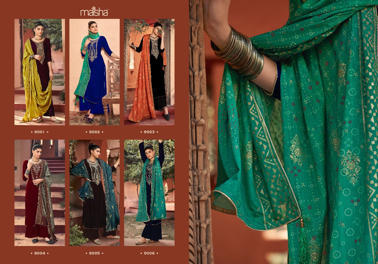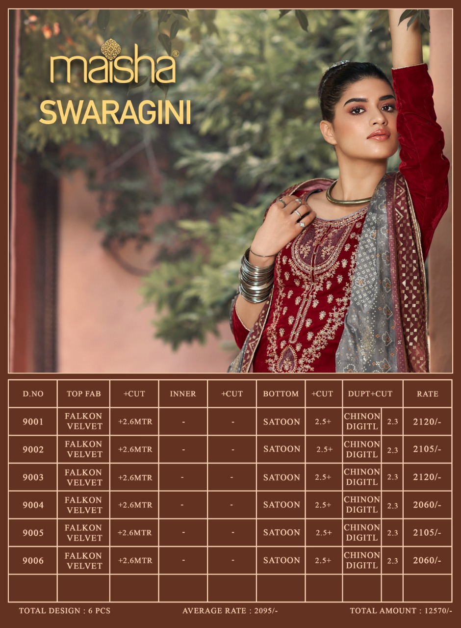 Buy Online Maisha Maskeen Swaragini Series 9001 To 9006 Designer Party Wear Suits Wholesale Supplier Gujarat 6 Pcs of Full Catalogue at Wholesale Price. Looking for Maisha Maskeen Swaragini Series 9001 To 9006 Designer Party Wear Suits Wholesale Supplier Gujarat Full Catalouge at Best Price? Buy Now Maisha Maskeen Swaragini Series 9001 To 9006 Designer Party Wear Suits Wholesale Supplier Gujarat at Wholesale Rate of Rs 12570 with Total 6 Pcs from authroized dealer and supplier of MAISHA Brand. Cost of Each piece is just only Rs 2095 which is very low and affordable price to resale the product in your retail store ,This is Surat based Wholesale Supplier & Dealer of MAISHA Brand. Click on Brand name to Know more about MAISHA Brand's products.Call or Whatsapp on 9898838984 for booking or enquiry