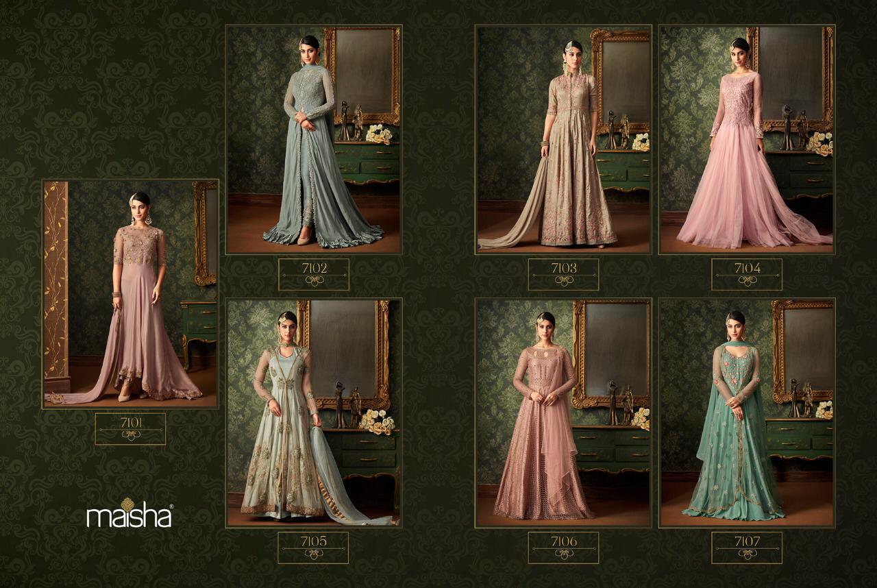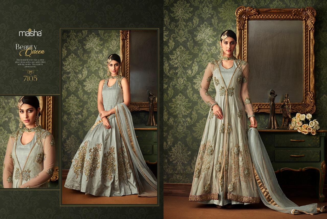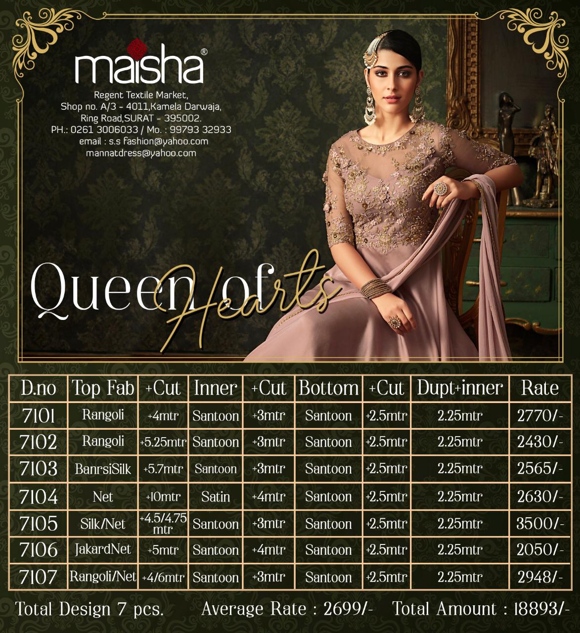 Buy Online Maisha Queen Of Hearts Series 7101 To 7107 Beautiful Designer Party Wear Suits Wholesale Supplier Surat 7 Pcs of Full Catalogue at Wholesale Price. Looking for Maisha Queen Of Hearts Series 7101 To 7107 Beautiful Designer Party Wear Suits Wholesale Supplier Surat Full Catalouge at Best Price? Buy Now Maisha Queen Of Hearts Series 7101 To 7107 Beautiful Designer Party Wear Suits Wholesale Supplier Surat at Wholesale Rate of Rs 18893 with Total 7 Pcs from authroized dealer and supplier of MAISHA Brand. Cost of Each piece is just only Rs 2699 which is very low and affordable price to resale the product in your retail store ,This is Surat based Wholesale Supplier & Dealer of MAISHA Brand. Click on Brand name to Know more about MAISHA Brand's products.Call or Whatsapp on 9898838984 for booking or enquiry