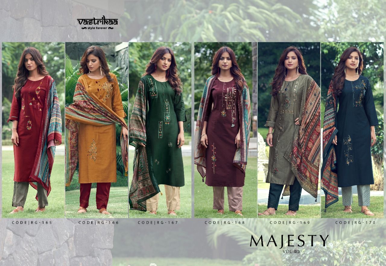 Buy Online Majesty Vol 5 Vastrikaa Dealer And Exporter Surat Gujarat 6 Pcs of Full Catalogue at Wholesale Price. Looking for Majesty Vol 5 Vastrikaa Dealer And Exporter Surat Gujarat Full Catalouge at Best Price? Buy Now Majesty Vol 5 Vastrikaa Dealer And Exporter Surat Gujarat at Wholesale Rate of Rs 5700 with Total 6 Pcs from authroized dealer and supplier of VASTRIKAA Brand. Cost of Each piece is just only Rs 950 which is very low and affordable price to resale the product in your retail store ,This is Surat based Wholesale Supplier & Dealer of VASTRIKAA Brand. Click on Brand name to Know more about VASTRIKAA Brand's products.Call or Whatsapp on 9898838984 for booking or enquiry