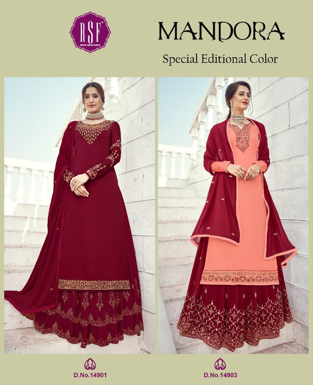 *MANDORA* by RSF *1795/-* *Special Design* ????????? *Single Available.......* D no :- 14901 Merun colour D no :- 14903 Peach colour Top :- Satin Gorgette heavy work Bottom:- Faux sarara heavy fourside work Inner :- Dull santun Extra bottom :- dull santun Dupatta:- Chinon embro work Rate:- 1795/- * Singel PCÂ?s Availab * Single extra 100 Order today...... Delivery 7-10 days ??Rsf surat |