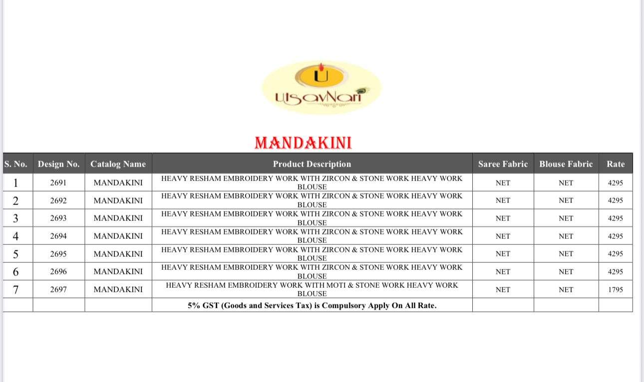 Buy Online MANDAKINI by UTSAVNARI saree collection manufacturer surat 7 Pcs of Full Catalogue at Wholesale Price. Looking for MANDAKINI by UTSAVNARI saree collection manufacturer surat Full Catalouge at Best Price? Buy Now MANDAKINI by UTSAVNARI saree collection manufacturer surat at Wholesale Rate of Rs 0 with Total 7 Pcs from authroized dealer and supplier of UTSAV NARI Brand. Cost of Each piece is just only Rs 0 which is very low and affordable price to resale the product in your retail store ,This is Surat based Wholesale Supplier & Dealer of UTSAV NARI Brand. Click on Brand name to Know more about UTSAV NARI Brand's products.Call or Whatsapp on 9898838984 for booking or enquiry