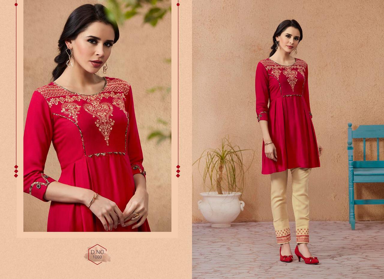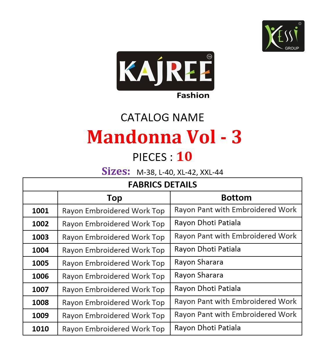 Buy Online Mandonna Vol 3 By Kajree 1001 Series Fancy Reyon Emb Kurti Bottom Wholesale Dealer Surat 9 Pcs of Full Catalogue at Wholesale Price. Looking for Mandonna Vol 3 By Kajree 1001 Series Fancy Reyon Emb Kurti Bottom Wholesale Dealer Surat Full Catalouge at Best Price? Buy Now Mandonna Vol 3 By Kajree 1001 Series Fancy Reyon Emb Kurti Bottom Wholesale Dealer Surat at Wholesale Rate of Rs 6291 with Total 9 Pcs from authroized dealer and supplier of KESSI Brand. Cost of Each piece is just only Rs 699 which is very low and affordable price to resale the product in your retail store ,This is Surat based Wholesale Supplier & Dealer of KESSI Brand. Click on Brand name to Know more about KESSI Brand's products.Call or Whatsapp on 9898838984 for booking or enquiry