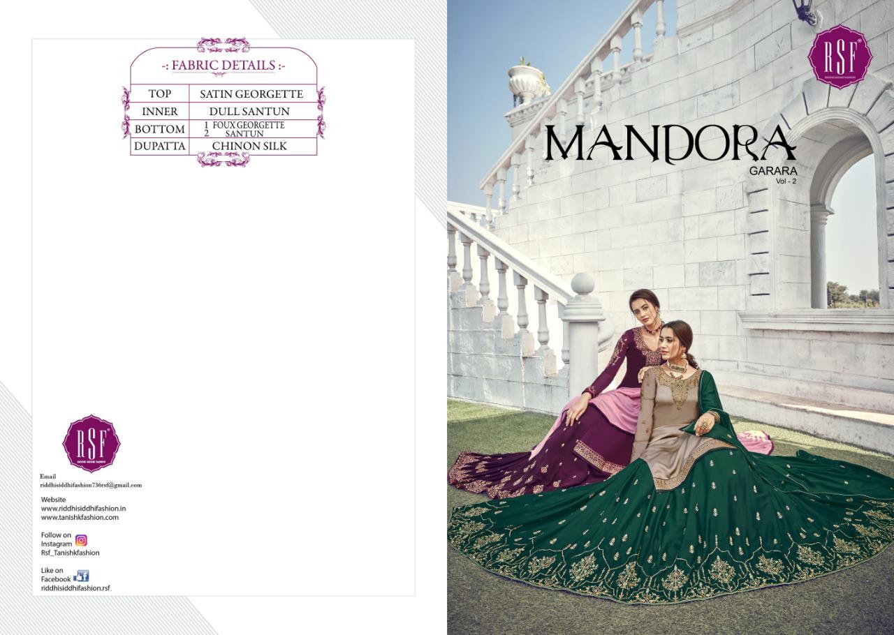 Buy Online Mandora Vol 2 By Rsf Garara With Pant Suits Collection Wholesale Supplier And Dealer Surat 6 Pcs of Full Catalogue at Wholesale Price. Looking for Mandora Vol 2 By Rsf Garara With Pant Suits Collection Wholesale Supplier And Dealer Surat Full Catalouge at Best Price? Buy Now Mandora Vol 2 By Rsf Garara With Pant Suits Collection Wholesale Supplier And Dealer Surat at Wholesale Rate of Rs 10770 with Total 6 Pcs from authroized dealer and supplier of RSF Brand. Cost of Each piece is just only Rs 1795 which is very low and affordable price to resale the product in your retail store ,This is Surat based Wholesale Supplier & Dealer of RSF Brand. Click on Brand name to Know more about RSF Brand's products.Call or Whatsapp on 9898838984 for booking or enquiry