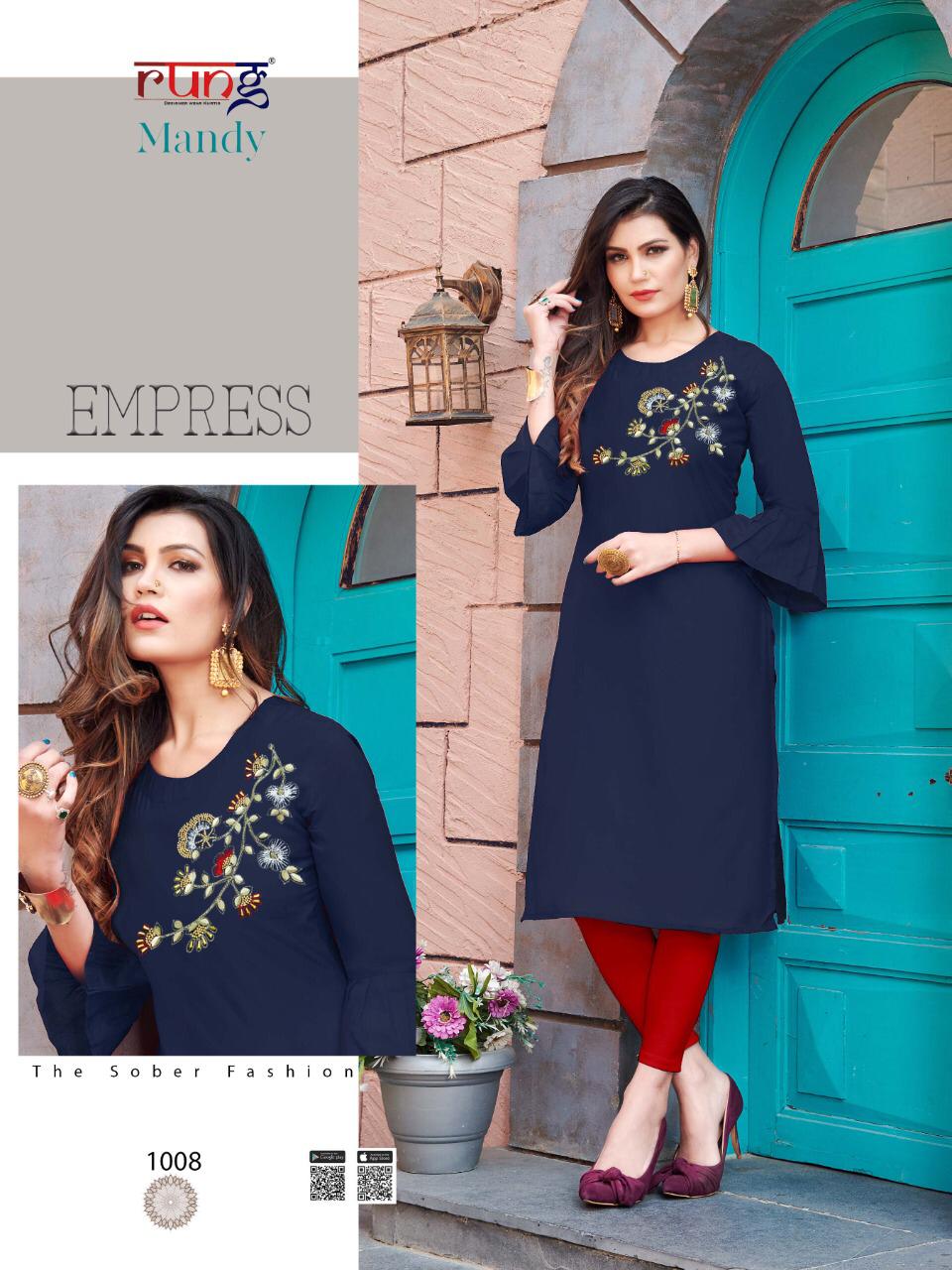 MANDY by Rung KURTI CATLOG FABRIC.HEAVY MODAL SILK WITH INNER WITH HAND WORK SIZE. .M.L. XL.XXXL PCS. 8 RATE WHOLSALE 390 Per pcs . Set to set . Online selling rate must be 415 per pcs . Delivery from today |