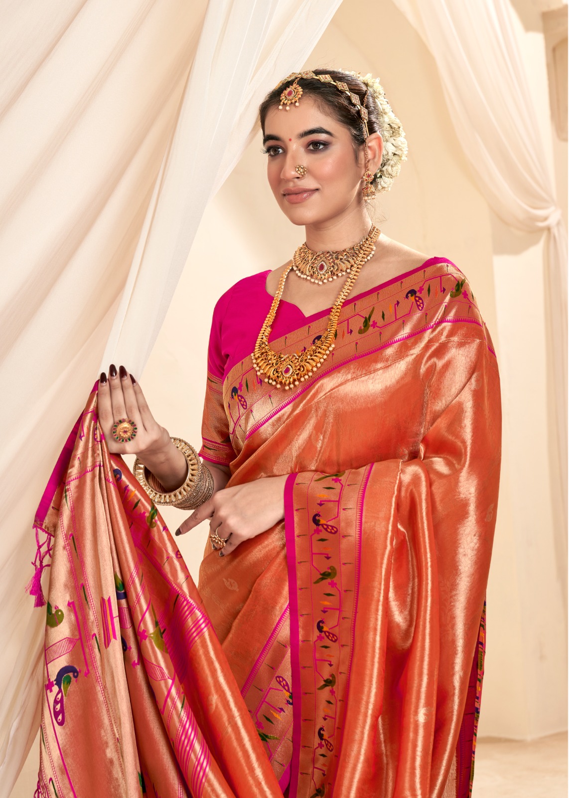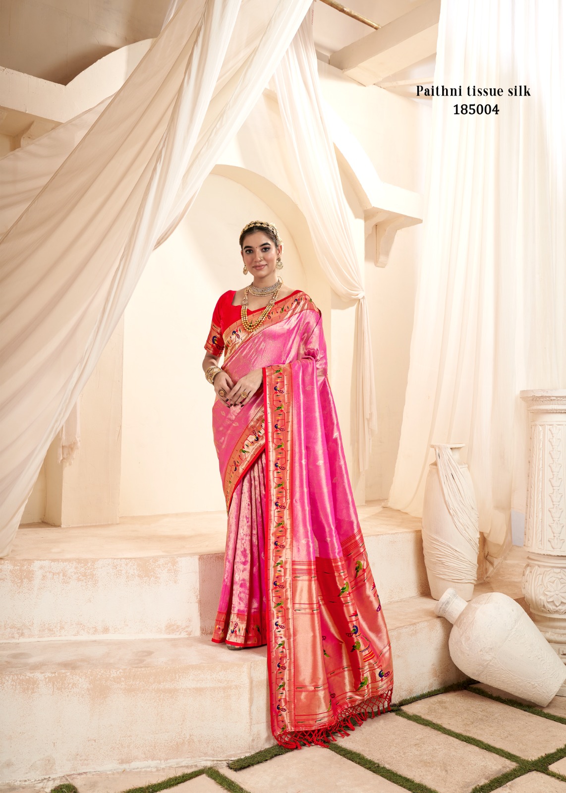 The Saree Is Crafted From Soft Tissue Silk, A Delicate And Lightweight Fabric Known For Its Sheer Texture And Smooth Feel. Tissue Silk Is Revered For Its Luxurious Appearance And Is Often Used In Creating Premium Traditional Indian Attire. Brand : Rajpath Catalog: Mangalya Silk (185000 Series) Series : -185001 To 185008 Rate : 1995/- +5% Gst Saree Fabric : Soft Tissue Silk Adorned With A Contrasting Paithni Border ,Often Embellished With Intricate Gold Zari Work With Tussles Attached On Pallu Blouse: Silk Weaving Work Unstitched Blouse Occasion : Wedding Wear, Festival Wear, Cultural Celebration SINGLE AVAILABLE 100+ SINGLE |