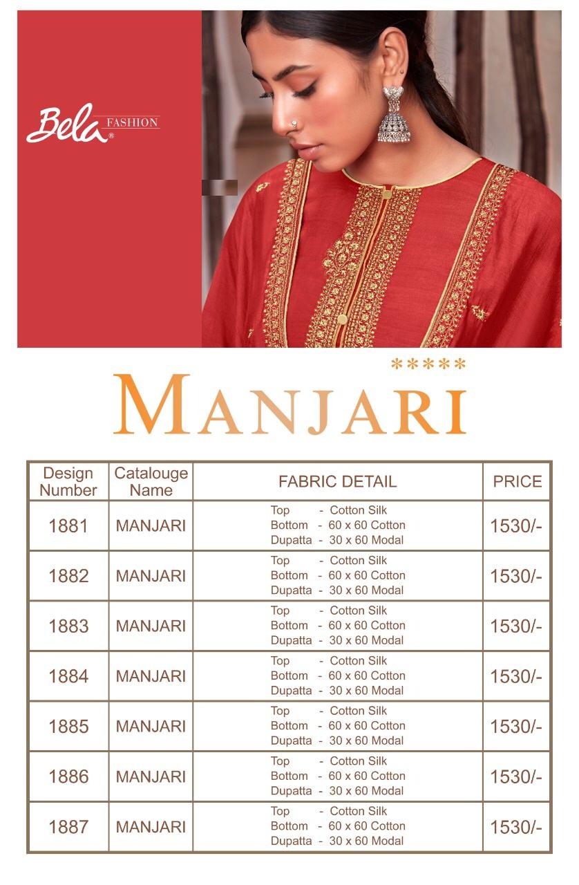 Buy Online Manjari Series 1881 To 1887 By Bela Fashion Single And Set Stockiest And Supplier From Surat 7 Pcs of Full Catalogue at Wholesale Price. Looking for Manjari Series 1881 To 1887 By Bela Fashion Single And Set Stockiest And Supplier From Surat Full Catalouge at Best Price? Buy Now Manjari Series 1881 To 1887 By Bela Fashion Single And Set Stockiest And Supplier From Surat at Wholesale Rate of Rs 10710 with Total 7 Pcs from authroized dealer and supplier of BELA Brand. Cost of Each piece is just only Rs 1530 which is very low and affordable price to resale the product in your retail store ,This is Surat based Wholesale Supplier & Dealer of BELA Brand. Click on Brand name to Know more about BELA Brand's products.Call or Whatsapp on 9898838984 for booking or enquiry