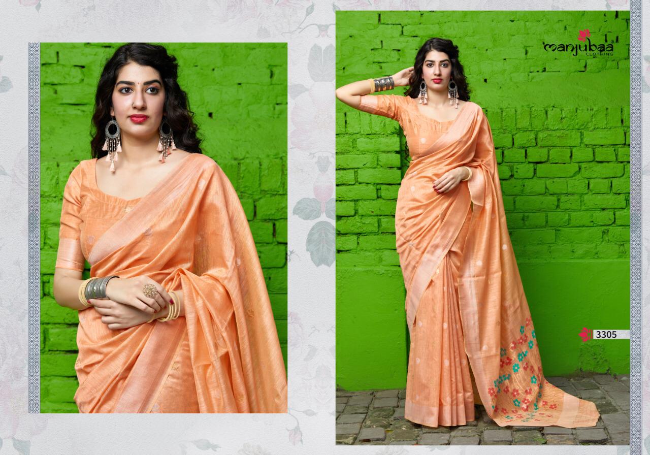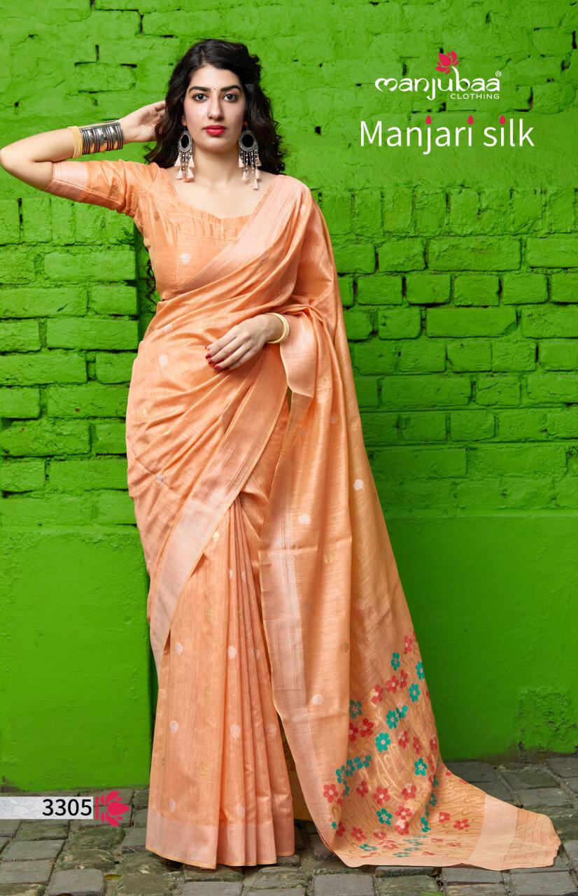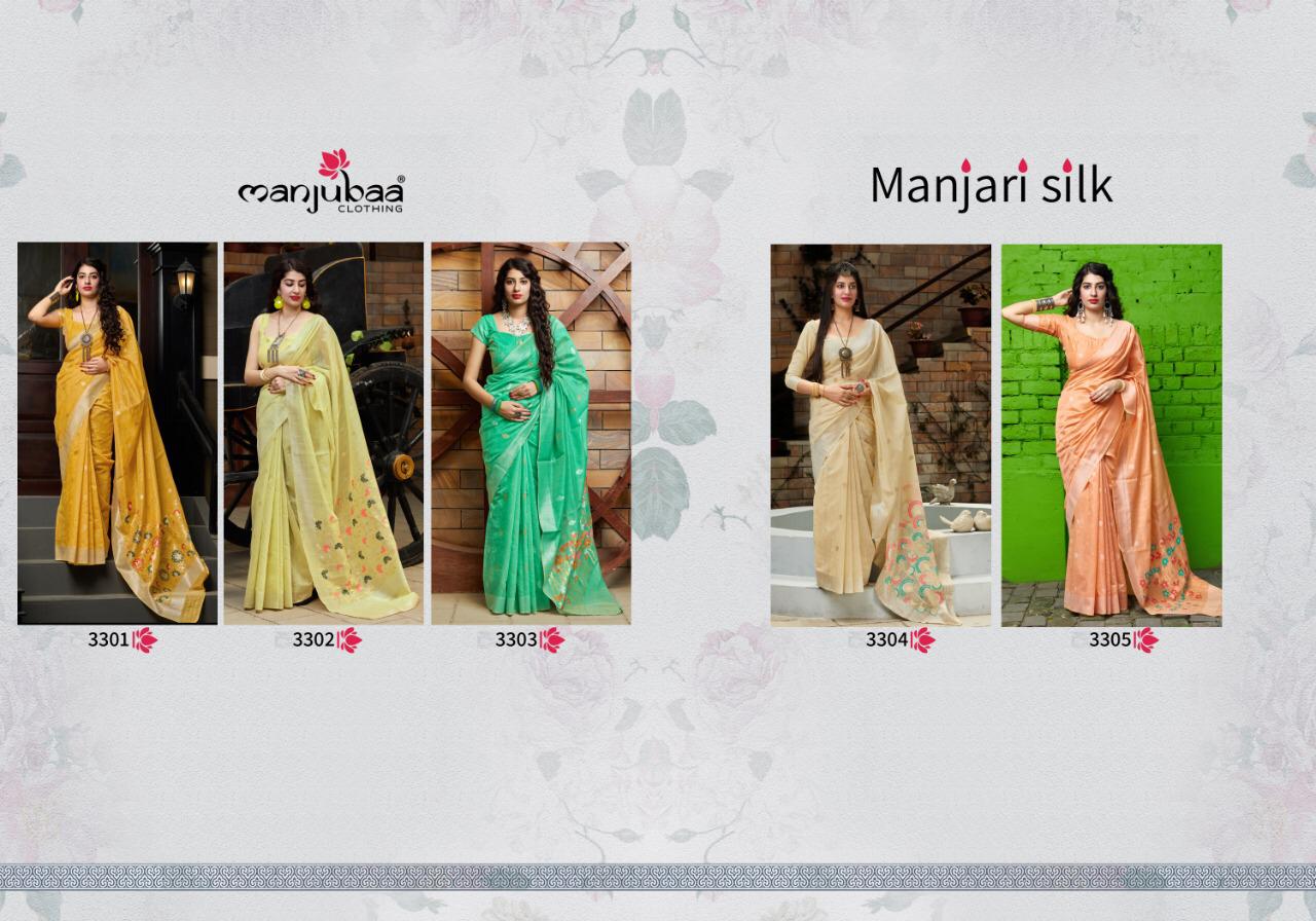 Buy Online Manjari Silk By Manjubaa Series 3301 To 3305 Silk Sarees Set And Single Wholesale Supplier Gujarat 5 Pcs of Full Catalogue at Wholesale Price. Looking for Manjari Silk By Manjubaa Series 3301 To 3305 Silk Sarees Set And Single Wholesale Supplier Gujarat Full Catalouge at Best Price? Buy Now Manjari Silk By Manjubaa Series 3301 To 3305 Silk Sarees Set And Single Wholesale Supplier Gujarat at Wholesale Rate of Rs 8475 with Total 5 Pcs from authroized dealer and supplier of Manjubaa Clothing Brand. Cost of Each piece is just only Rs 1695 which is very low and affordable price to resale the product in your retail store ,This is Surat based Wholesale Supplier & Dealer of Manjubaa Clothing Brand. Click on Brand name to Know more about Manjubaa Clothing Brand's products.Call or Whatsapp on 9898838984 for booking or enquiry