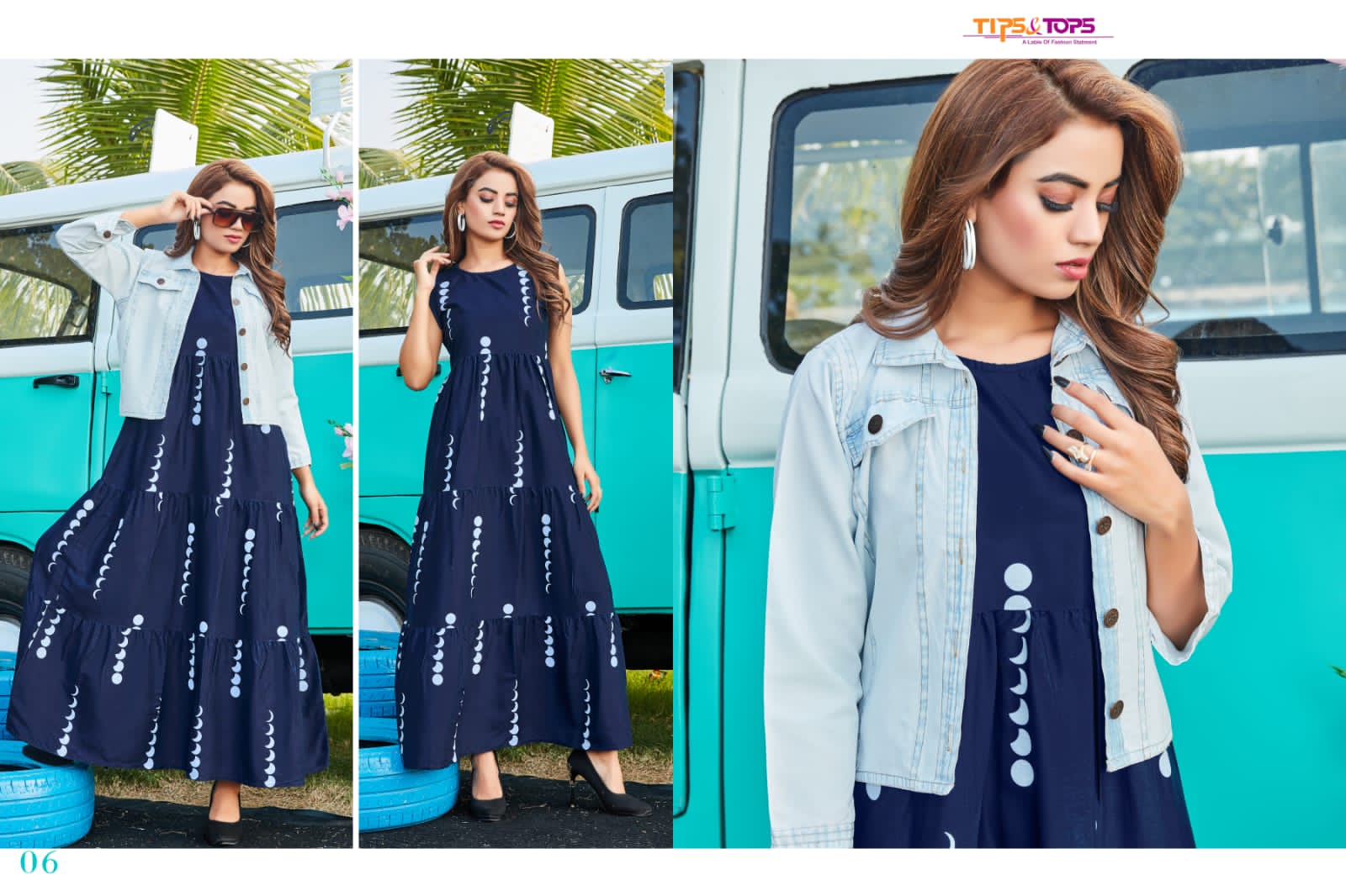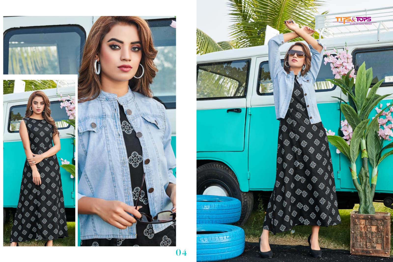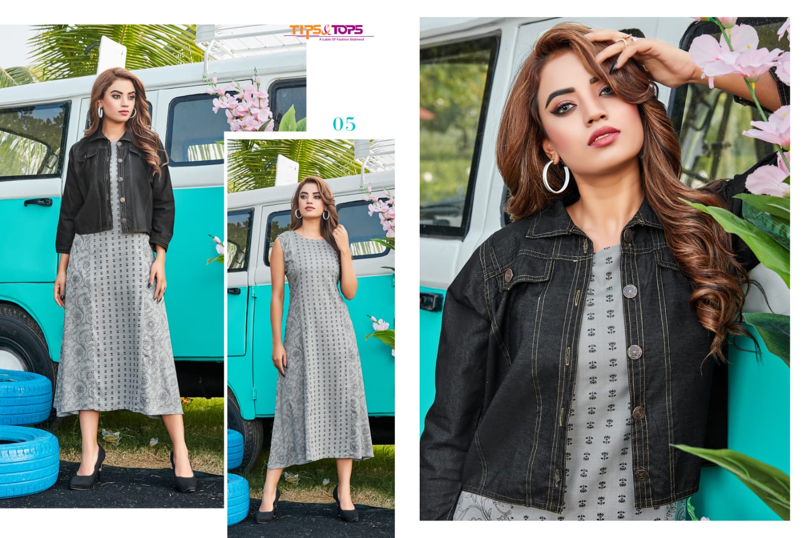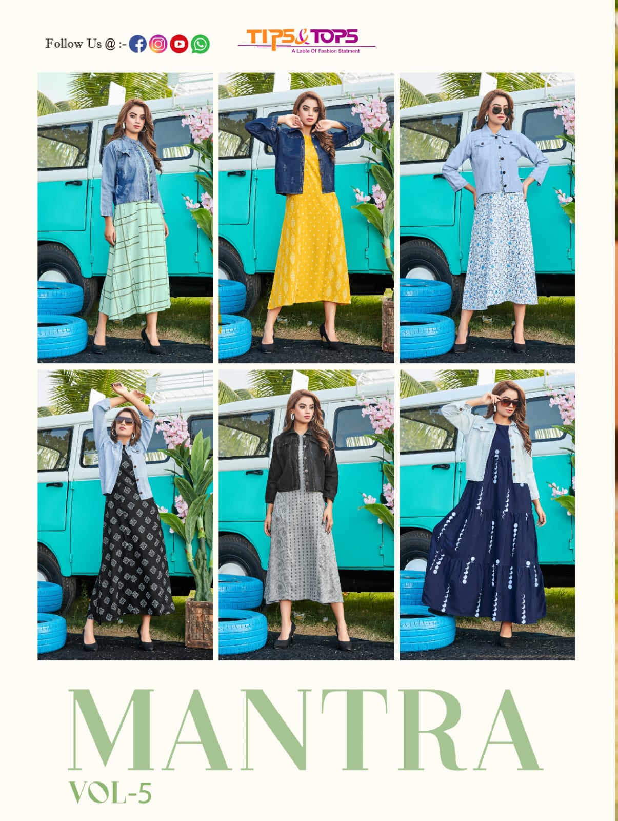Buy Online Mantra Vol 5 By Tips Tops Kurti With Jacket Wholesaler Supplier From Surat 6 Pcs of Full Catalogue at Wholesale Price. Looking for Mantra Vol 5 By Tips Tops Kurti With Jacket Wholesaler Supplier From Surat Full Catalouge at Best Price? Buy Now Mantra Vol 5 By Tips Tops Kurti With Jacket Wholesaler Supplier From Surat at Wholesale Rate of Rs 4590 with Total 6 Pcs from authroized dealer and supplier of Brand. Cost of Each piece is just only Rs 765 which is very low and affordable price to resale the product in your retail store ,This is Surat based Wholesale Supplier & Dealer of Brand. Click on Brand name to Know more about Brand's products.Call or Whatsapp on 9898838984 for booking or enquiry