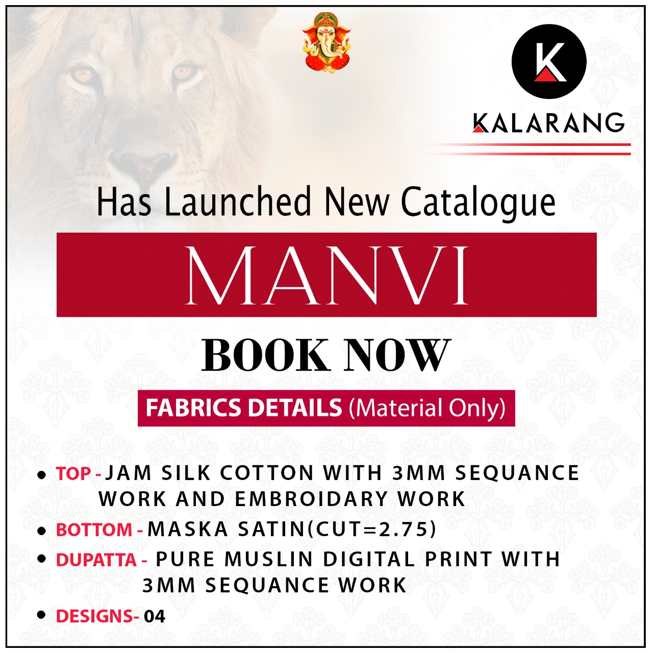 Buy Online Manvi By Kalarang Manufacturer And Dealer From All Over India 4 Pcs of Full Catalogue at Wholesale Price. Looking for Manvi By Kalarang Manufacturer And Dealer From All Over India Full Catalouge at Best Price? Buy Now Manvi By Kalarang Manufacturer And Dealer From All Over India at Wholesale Rate of Rs 3804 with Total 4 Pcs from authroized dealer and supplier of KALARANG Brand. Cost of Each piece is just only Rs 951 which is very low and affordable price to resale the product in your retail store ,This is Surat based Wholesale Supplier & Dealer of KALARANG Brand. Click on Brand name to Know more about KALARANG Brand's products.Call or Whatsapp on 9898838984 for booking or enquiry