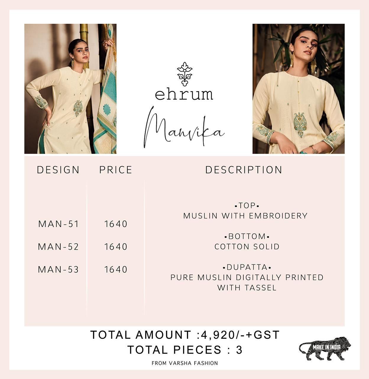 Buy Online Manvika By Ehrum Designer Suits Dealer And Exporter Surat Gujarat 3 Pcs of Full Catalogue at Wholesale Price. Looking for Manvika By Ehrum Designer Suits Dealer And Exporter Surat Gujarat Full Catalouge at Best Price? Buy Now Manvika By Ehrum Designer Suits Dealer And Exporter Surat Gujarat at Wholesale Rate of Rs 4920 with Total 3 Pcs from authroized dealer and supplier of Brand. Cost of Each piece is just only Rs 1640 which is very low and affordable price to resale the product in your retail store ,This is Surat based Wholesale Supplier & Dealer of Brand. Click on Brand name to Know more about Brand's products.Call or Whatsapp on 9898838984 for booking or enquiry