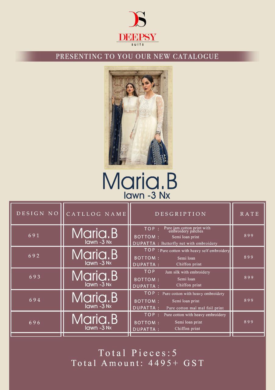 Buy Online Maria B Lawn 3 Nx By Deepsy Series 691 Pakistani Suits Wholesale Supplier And Dealer Gujarat 5 Pcs of Full Catalogue at Wholesale Price. Looking for Maria B Lawn 3 Nx By Deepsy Series 691 Pakistani Suits Wholesale Supplier And Dealer Gujarat Full Catalouge at Best Price? Buy Now Maria B Lawn 3 Nx By Deepsy Series 691 Pakistani Suits Wholesale Supplier And Dealer Gujarat at Wholesale Rate of Rs 4495 with Total 5 Pcs from authroized dealer and supplier of DEEPSY Brand. Cost of Each piece is just only Rs 899 which is very low and affordable price to resale the product in your retail store ,This is Surat based Wholesale Supplier & Dealer of DEEPSY Brand. Click on Brand name to Know more about DEEPSY Brand's products.Call or Whatsapp on 9898838984 for booking or enquiry