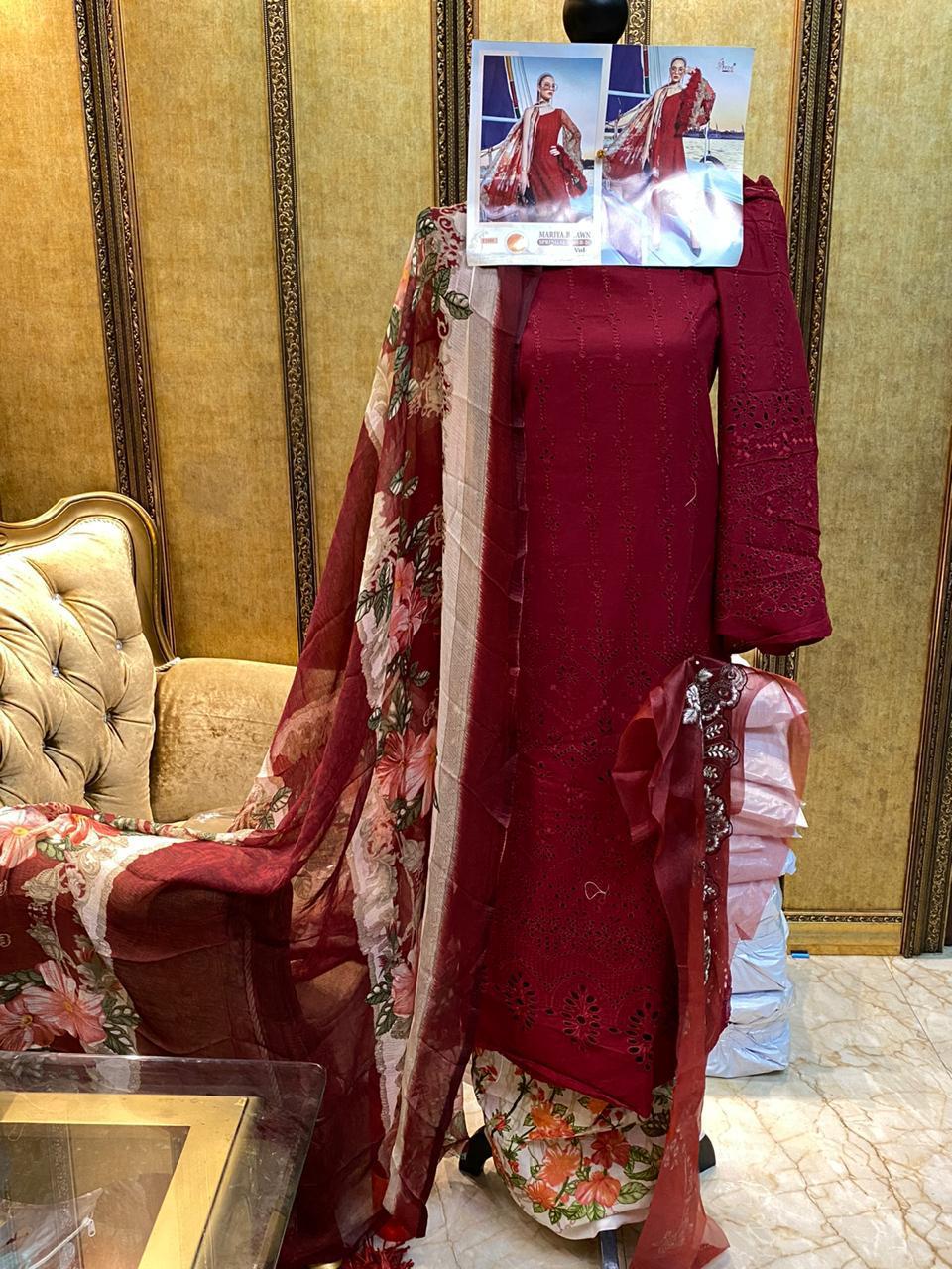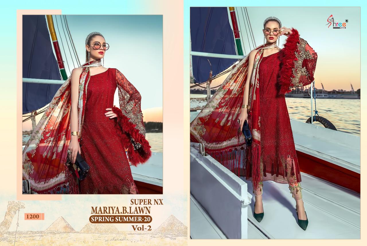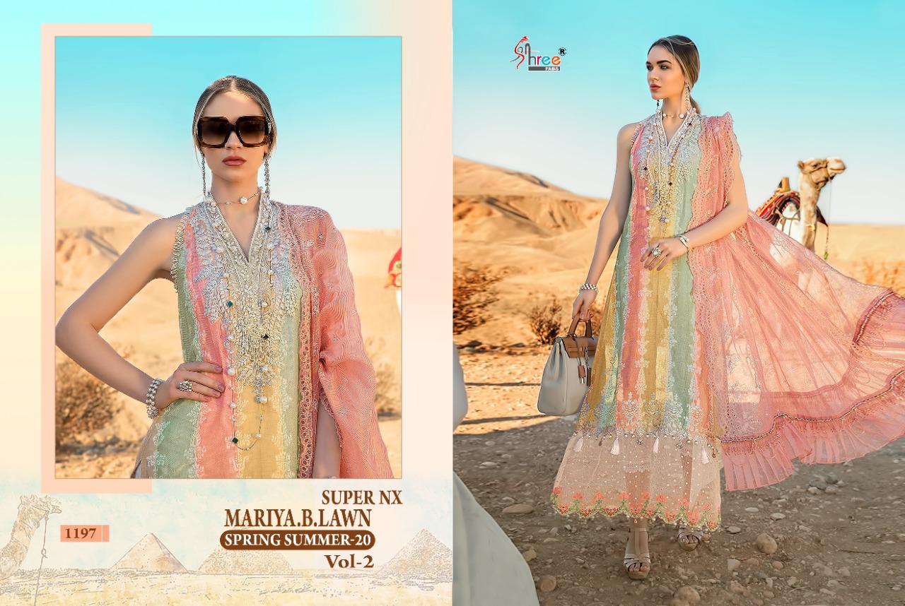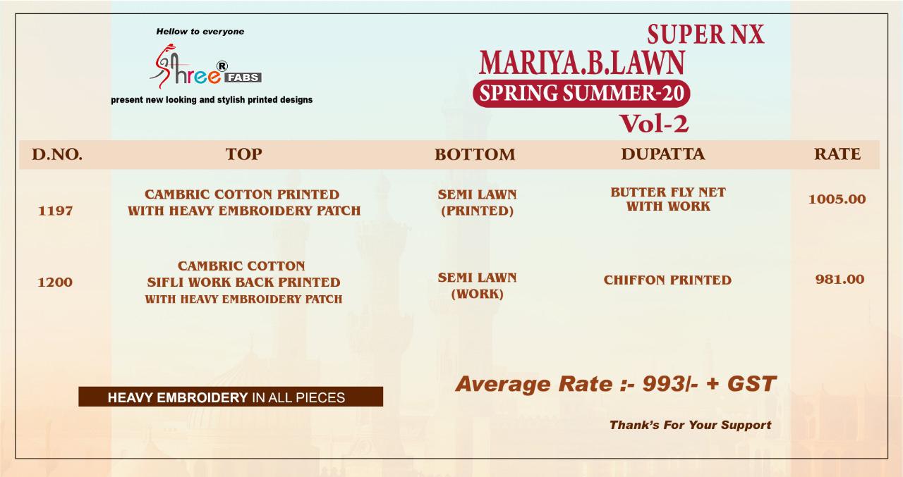 MARIYA B LAWN SPRING 20. VOL-2 SUPER NX TOP PURE COTTON WITH EXCLUSIVE EMBRODERY BOTTOM D NO. 1197 SEMI LAWN PRINT D NO. 1200 SEMI LAWN WORK DUPPTA D NO 1200 CHIFFON PRINT D NO 1197 HEAVY WORK ON BUTTERFLY NET DUPTTA DES 2 RATE 993/- + gst Shree fabs surat |