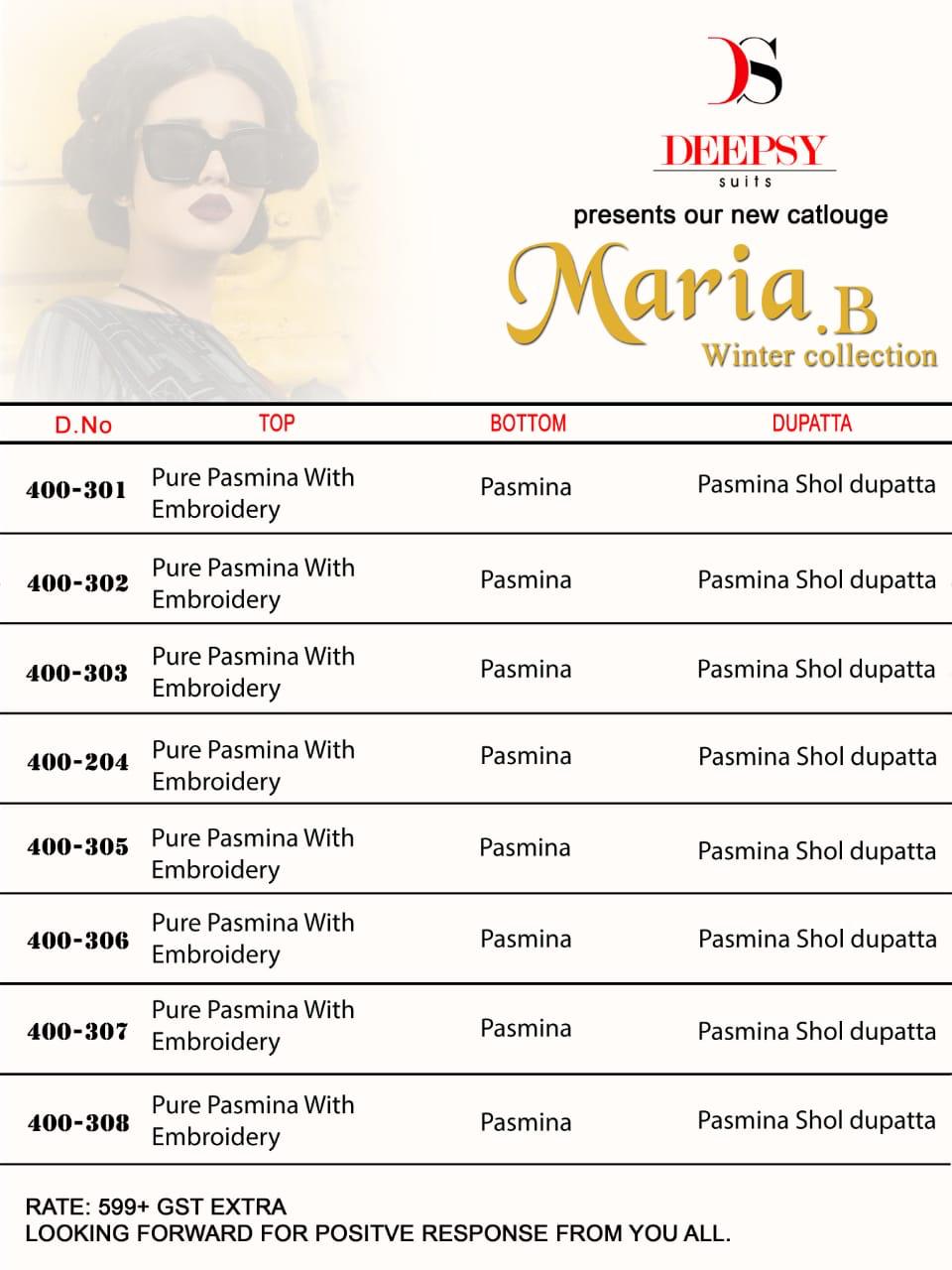 Buy Online Maria B Winter Collection By Deepsy 400301 Series Pure Pashmina Printed Salwar Kameez Catlog Wholesaler Surat 8 Pcs of Full Catalogue at Wholesale Price. Looking for Maria B Winter Collection By Deepsy 400301 Series Pure Pashmina Printed Salwar Kameez Catlog Wholesaler Surat Full Catalouge at Best Price? Buy Now Maria B Winter Collection By Deepsy 400301 Series Pure Pashmina Printed Salwar Kameez Catlog Wholesaler Surat at Wholesale Rate of Rs 4792 with Total 8 Pcs from authroized dealer and supplier of DEEPSY Brand. Cost of Each piece is just only Rs 599 which is very low and affordable price to resale the product in your retail store ,This is Surat based Wholesale Supplier & Dealer of DEEPSY Brand. Click on Brand name to Know more about DEEPSY Brand's products.Call or Whatsapp on 9898838984 for booking or enquiry