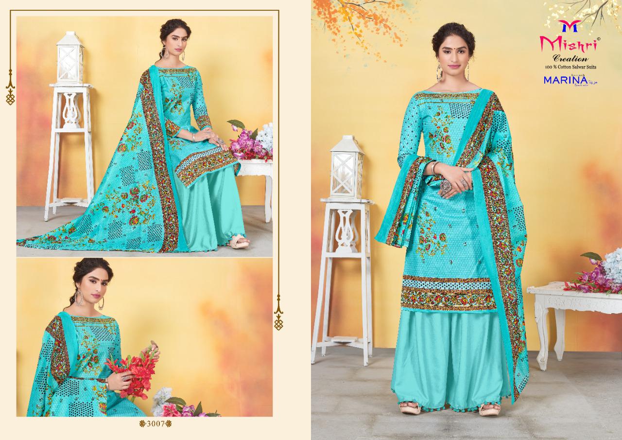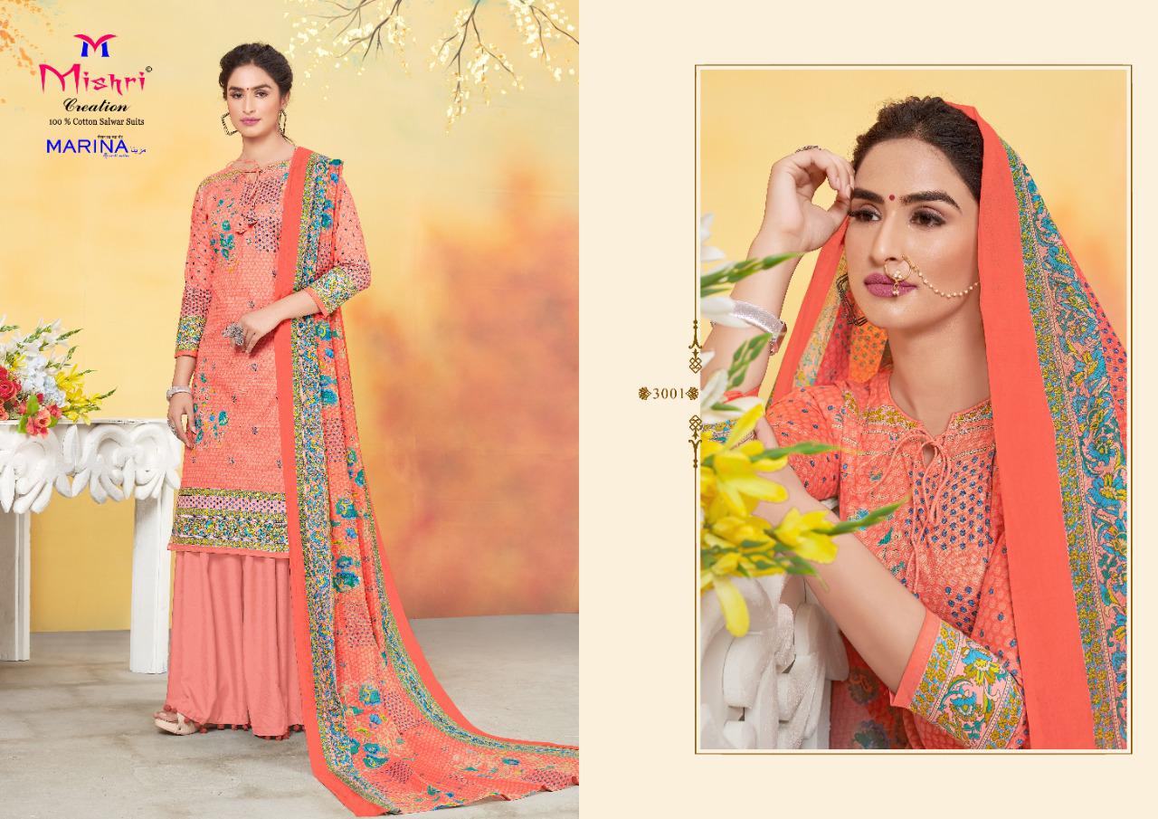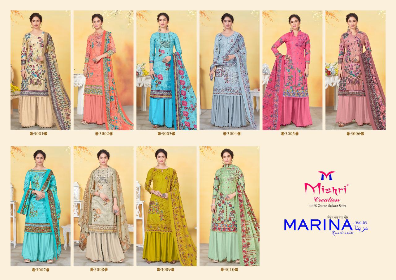 ? *MISHRI CREATION * ? Dear Customer, Today we are launching Designer Catlouge ???????? ? *Catlouge Name* *? MARINA VOL-3 ?* (Karachi Style) Heavy pure Cotton ???????? ? *Pcs* :- 10 Pieces In Set ?10 Designes ?10 Colours ? *fabric Details* ? *Top:-*Cotton (2.40Mtr) ? *Bottom:-* Printed Cotton (2 Mtr) ? *Dupatta:-* Cotton Printed (2.25Mtr) ? ? *Rate :-345+GST* ? *Packing Details:-* *Per pices Pouch Packing *10 pics in beautiful lather bag ? *Regards* MISHRI CREATION |