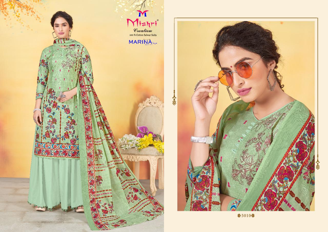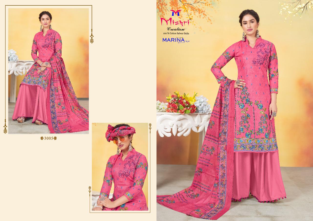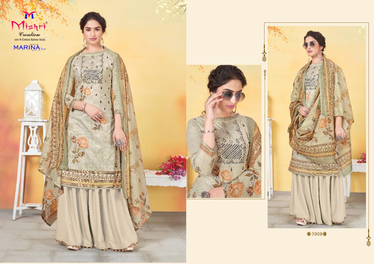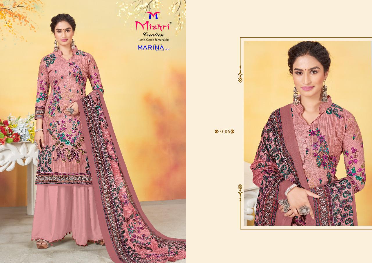 ? *MISHRI CREATION * ? Dear Customer, Today we are launching Designer Catlouge ???????? ? *Catlouge Name* *? MARINA VOL-3 ?* (Karachi Style) Heavy pure Cotton ???????? ? *Pcs* :- 10 Pieces In Set ?10 Designes ?10 Colours ? *fabric Details* ? *Top:-*Cotton (2.40Mtr) ? *Bottom:-* Printed Cotton (2 Mtr) ? *Dupatta:-* Cotton Printed (2.25Mtr) ? ? *Rate :-345+GST* ? *Packing Details:-* *Per pices Pouch Packing *10 pics in beautiful lather bag ? *Regards* MISHRI CREATION |