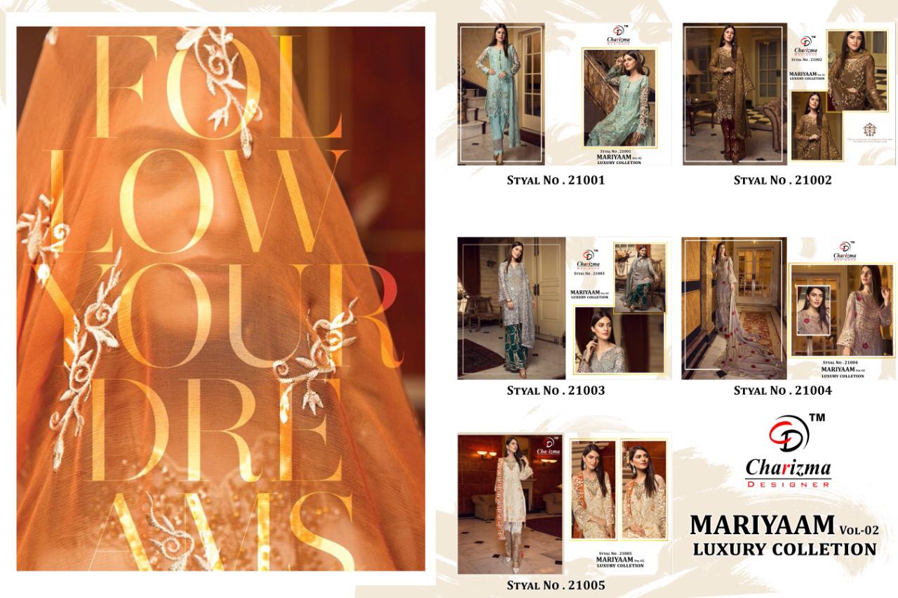 Buy Online Mariyaam Luxury Collection By Charizma Designer Series 21001 Pakistani Suits Wholesale Supplier Gujarat 5 Pcs of Full Catalogue at Wholesale Price. Looking for Mariyaam Luxury Collection By Charizma Designer Series 21001 Pakistani Suits Wholesale Supplier Gujarat Full Catalouge at Best Price? Buy Now Mariyaam Luxury Collection By Charizma Designer Series 21001 Pakistani Suits Wholesale Supplier Gujarat at Wholesale Rate of Rs 6245 with Total 5 Pcs from authroized dealer and supplier of Brand. Cost of Each piece is just only Rs 1249 which is very low and affordable price to resale the product in your retail store ,This is Surat based Wholesale Supplier & Dealer of Brand. Click on Brand name to Know more about Brand's products.Call or Whatsapp on 9898838984 for booking or enquiry