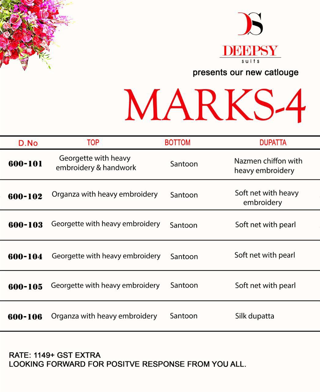 Buy Online Marks Vol 4 By Deepsy 600101 Series Fancy Pakistani Style Salwar Kameez Collection Wholesaler Surat 6 Pcs of Full Catalogue at Wholesale Price. Looking for Marks Vol 4 By Deepsy 600101 Series Fancy Pakistani Style Salwar Kameez Collection Wholesaler Surat Full Catalouge at Best Price? Buy Now Marks Vol 4 By Deepsy 600101 Series Fancy Pakistani Style Salwar Kameez Collection Wholesaler Surat at Wholesale Rate of Rs 6894 with Total 6 Pcs from authroized dealer and supplier of DEEPSY Brand. Cost of Each piece is just only Rs 1149 which is very low and affordable price to resale the product in your retail store ,This is Surat based Wholesale Supplier & Dealer of DEEPSY Brand. Click on Brand name to Know more about DEEPSY Brand's products.Call or Whatsapp on 9898838984 for booking or enquiry
