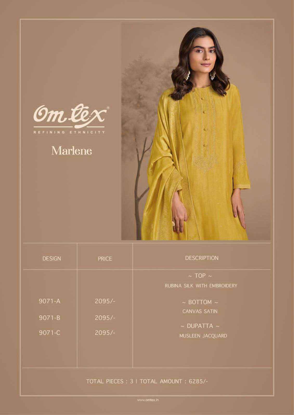 Buy Online MARLENE by OMTEX suit collection manufacturers surat 2 Pcs of Full Catalogue at Wholesale Price. Looking for MARLENE by OMTEX suit collection manufacturers surat Full Catalouge at Best Price? Buy Now MARLENE by OMTEX suit collection manufacturers surat at Wholesale Rate of Rs 4190 with Total 2 Pcs from authroized dealer and supplier of OM TEX Brand. Cost of Each piece is just only Rs 2095 which is very low and affordable price to resale the product in your retail store ,This is Surat based Wholesale Supplier & Dealer of OM TEX Brand. Click on Brand name to Know more about OM TEX Brand's products.Call or Whatsapp on 9898838984 for booking or enquiry