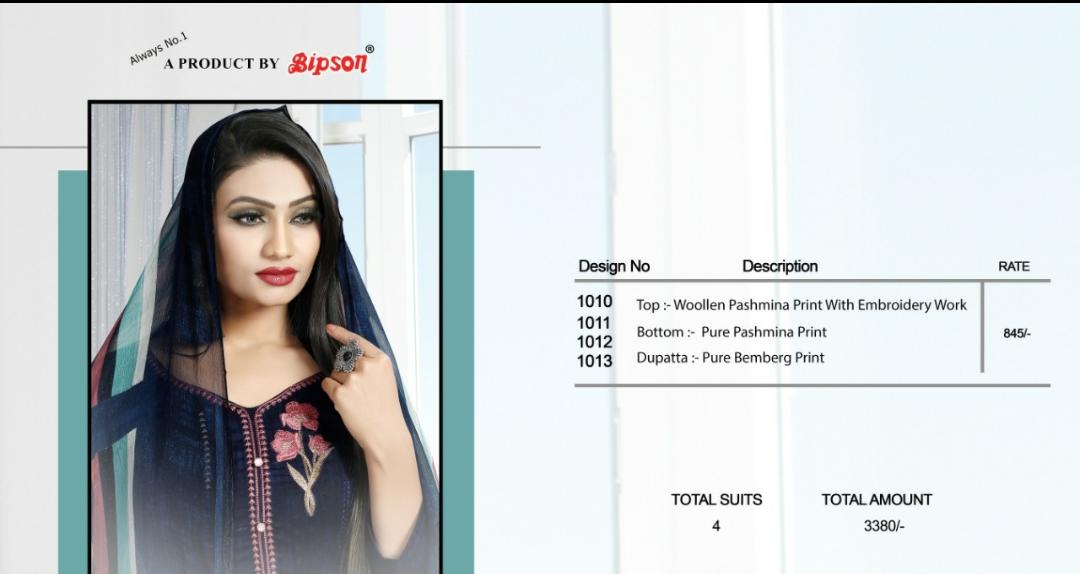 Buy Online Masakali By Bipson Pashmina Dress Materials Wholesale Supplier Surat 4 Pcs of Full Catalogue at Wholesale Price. Looking for Masakali By Bipson Pashmina Dress Materials Wholesale Supplier Surat Full Catalouge at Best Price? Buy Now Masakali By Bipson Pashmina Dress Materials Wholesale Supplier Surat at Wholesale Rate of Rs 3380 with Total 4 Pcs from authroized dealer and supplier of Brand. Cost of Each piece is just only Rs 845 which is very low and affordable price to resale the product in your retail store ,This is Surat based Wholesale Supplier & Dealer of Brand. Click on Brand name to Know more about Brand's products.Call or Whatsapp on 9898838984 for booking or enquiry