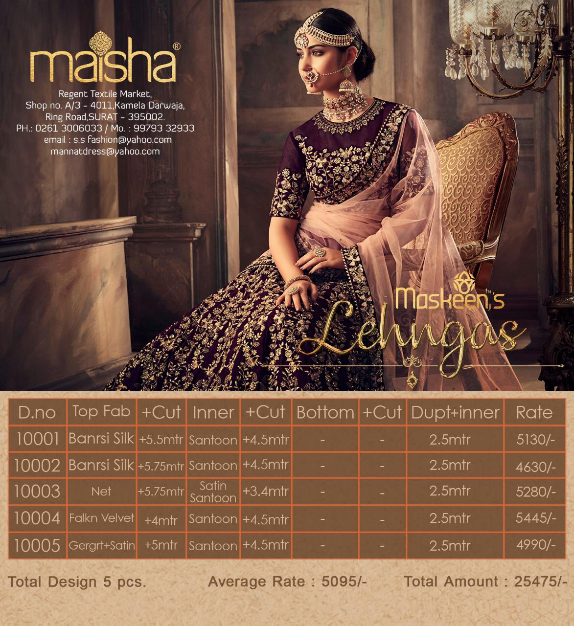 Buy Online Maskeen Maisha Lehangas Series 10001 To 10005 Beautiful Designer Party Wear Lehangas Wholesale Dealer Nd Exporter Nitya Nx Surat 5 Pcs of Full Catalogue at Wholesale Price. Looking for Maskeen Maisha Lehangas Series 10001 To 10005 Beautiful Designer Party Wear Lehangas Wholesale Dealer Nd Exporter Nitya Nx Surat Full Catalouge at Best Price? Buy Now Maskeen Maisha Lehangas Series 10001 To 10005 Beautiful Designer Party Wear Lehangas Wholesale Dealer Nd Exporter Nitya Nx Surat at Wholesale Rate of Rs 25475 with Total 5 Pcs from authroized dealer and supplier of MAISHA Brand. Cost of Each piece is just only Rs 5095 which is very low and affordable price to resale the product in your retail store ,This is Surat based Wholesale Supplier & Dealer of MAISHA Brand. Click on Brand name to Know more about MAISHA Brand's products.Call or Whatsapp on 9898838984 for booking or enquiry