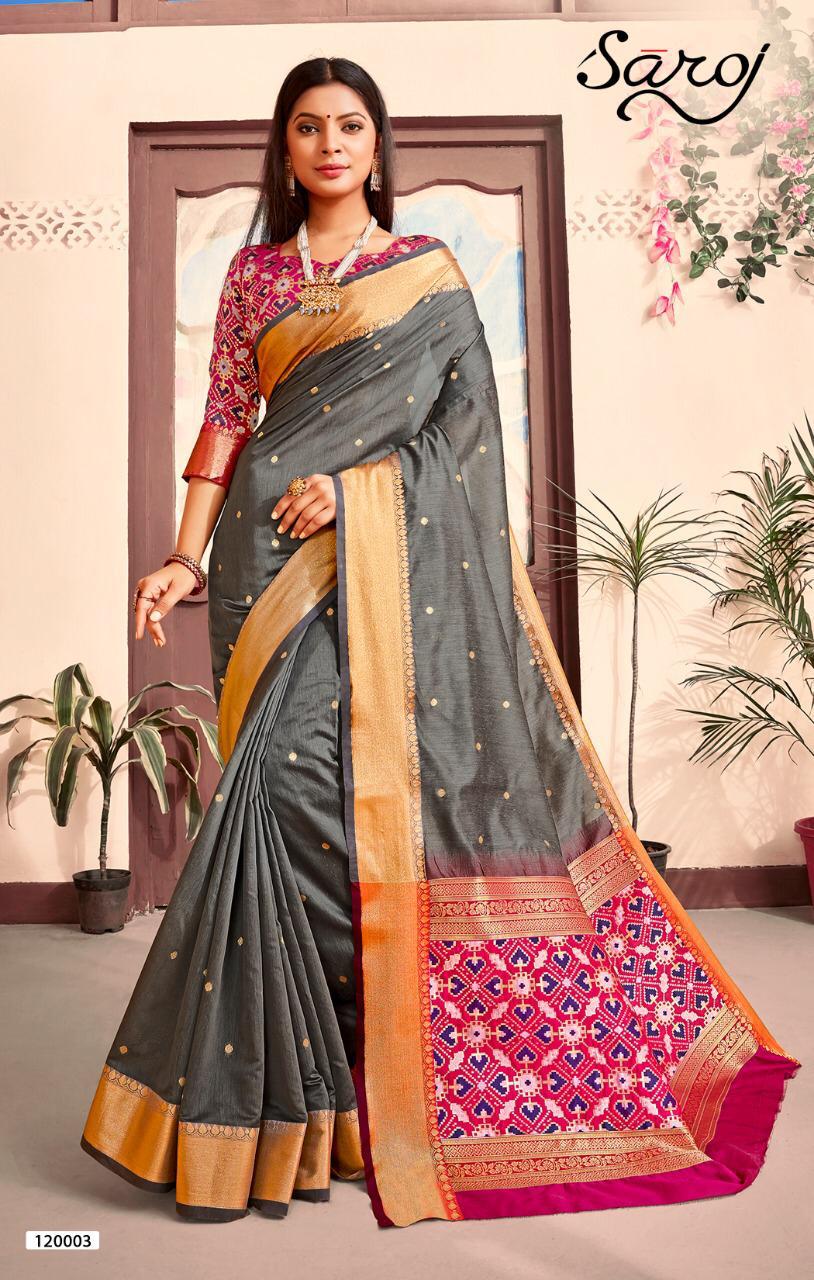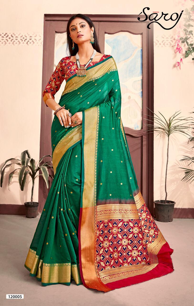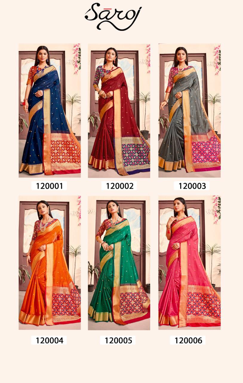 *Matka Silk by Saroj * Fabric: Matka Silk, Patola pattern, Blouse: Cotton Silk. 6 Designs in set . Rate - 1365 per Pcs . Set to set . Delivery 2 days |