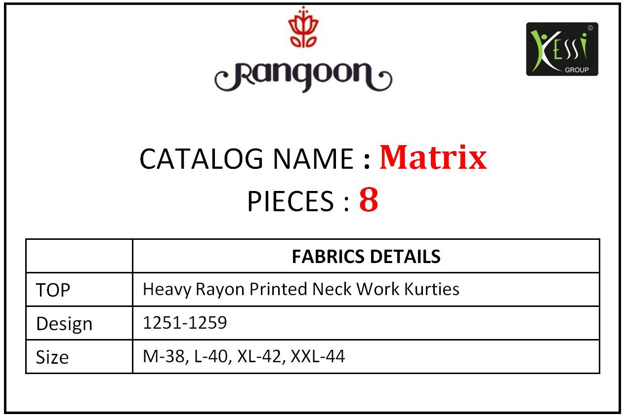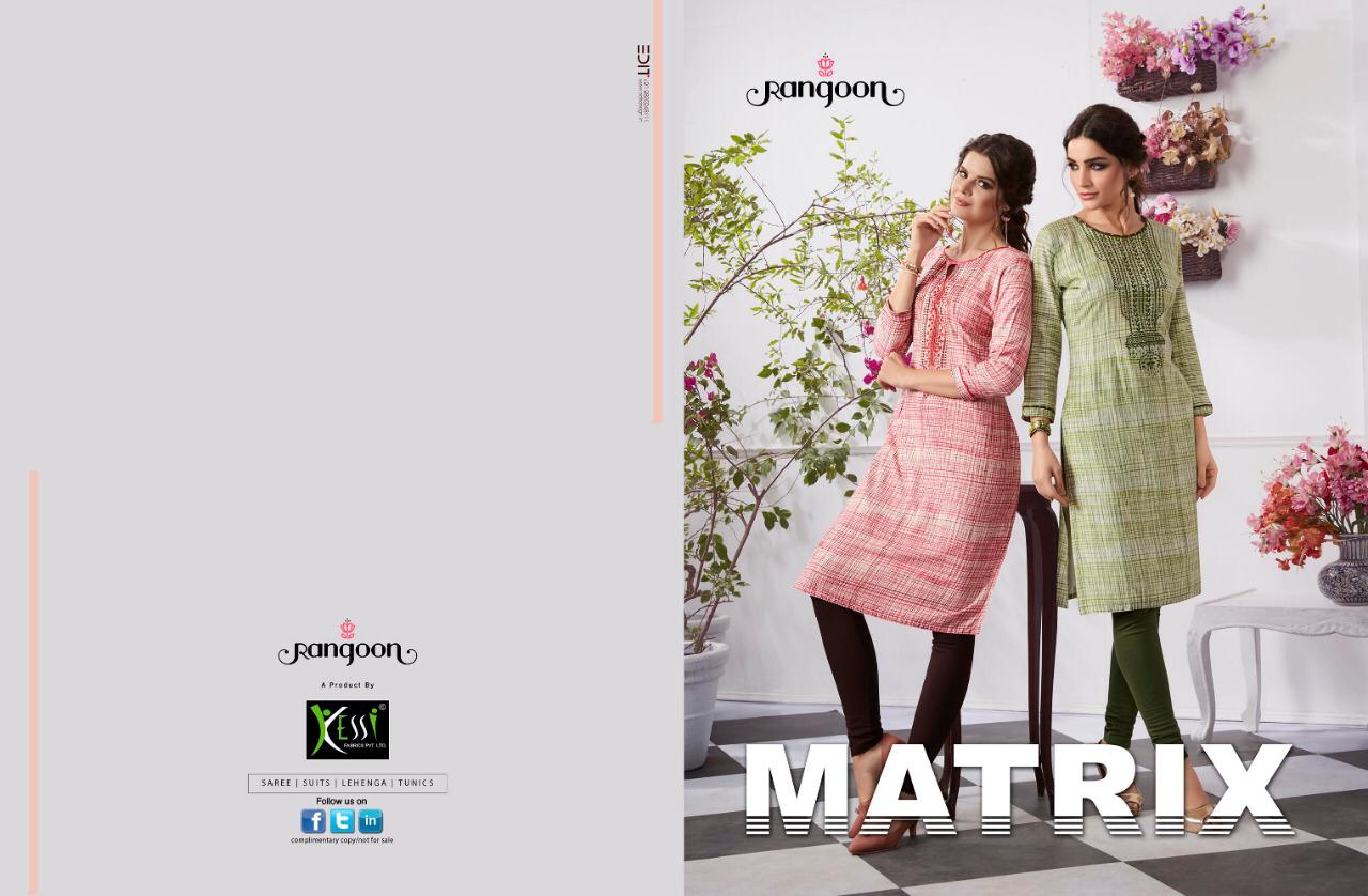 Buy Online Matrix By Rangoon Reyon Kurtis Collection Supplier India 8 Pcs of Full Catalogue at Wholesale Price. Looking for Matrix By Rangoon Reyon Kurtis Collection Supplier India Full Catalouge at Best Price? Buy Now Matrix By Rangoon Reyon Kurtis Collection Supplier India at Wholesale Rate of Rs 2800 with Total 8 Pcs from authroized dealer and supplier of RANGOON Brand. Cost of Each piece is just only Rs 350 which is very low and affordable price to resale the product in your retail store ,This is Surat based Wholesale Supplier & Dealer of RANGOON Brand. Click on Brand name to Know more about RANGOON Brand's products.Call or Whatsapp on 9898838984 for booking or enquiry