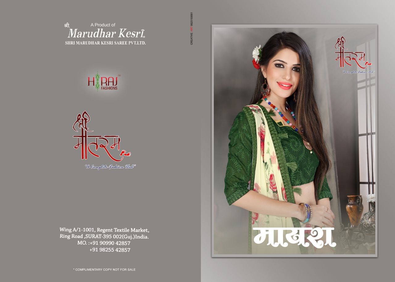 Brand Â? ???? Maataram product by ???? Marudhar kesri saree pvt ltd -Surat Catlog name Â? Mayra Fabrics- Pure Geo. With heavy blouse + border Total 12 saree in one set . *Rate - 650 per Pcs * Set to set . GST AND SHIP EXTRA |