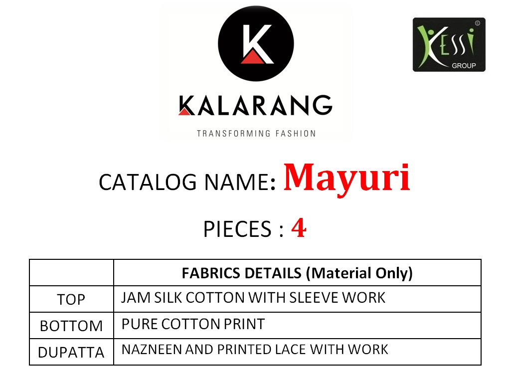 ? *Kalarang.* has launched _Catalog name_ : *Mayuri* ? _Fabric Details_ ? ?Top :- JAM SILK COTTON WITH SLEEVE WORK ?Bottom:- PURE COTTON PRINT ?Dupatta:- NAZNEEN AND PRINTED LACE WITH WORK ?Total Design :- 4 ?Dispatching 5 to 6 days later ?Booking started from now... ?Order yours soon.... Rate -850 per Pcs . Set to set . GST 5 Percent Extra. |