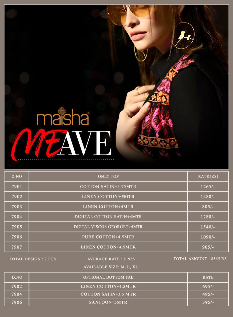 Buy Online Meave By Maisha Maskeen Series 7901 To 7906 Fancy Western Designer Dresses Wholesale Supplier Nd Dealer India 7 Pcs of Full Catalogue at Wholesale Price. Looking for Meave By Maisha Maskeen Series 7901 To 7906 Fancy Western Designer Dresses Wholesale Supplier Nd Dealer India Full Catalouge at Best Price? Buy Now Meave By Maisha Maskeen Series 7901 To 7906 Fancy Western Designer Dresses Wholesale Supplier Nd Dealer India at Wholesale Rate of Rs 8365 with Total 7 Pcs from authroized dealer and supplier of MAISHA Brand. Cost of Each piece is just only Rs 1195 which is very low and affordable price to resale the product in your retail store ,This is Surat based Wholesale Supplier & Dealer of MAISHA Brand. Click on Brand name to Know more about MAISHA Brand's products.Call or Whatsapp on 9898838984 for booking or enquiry