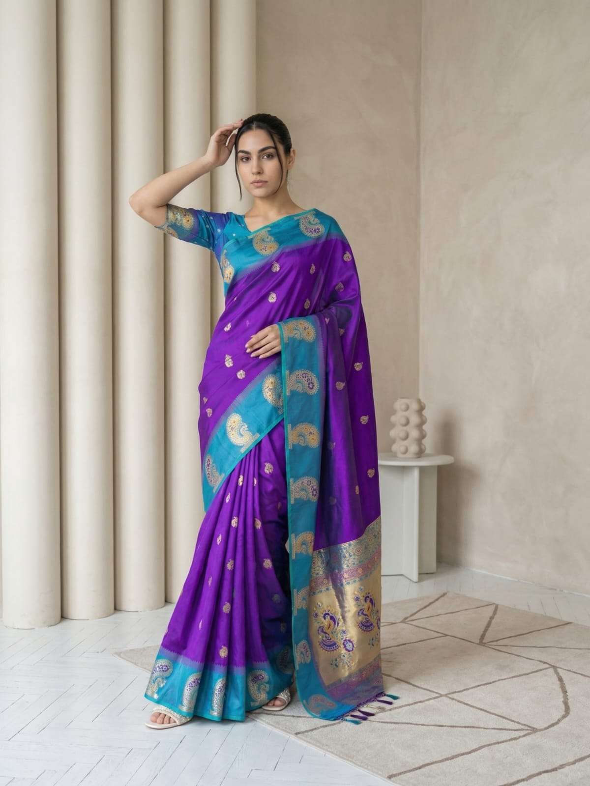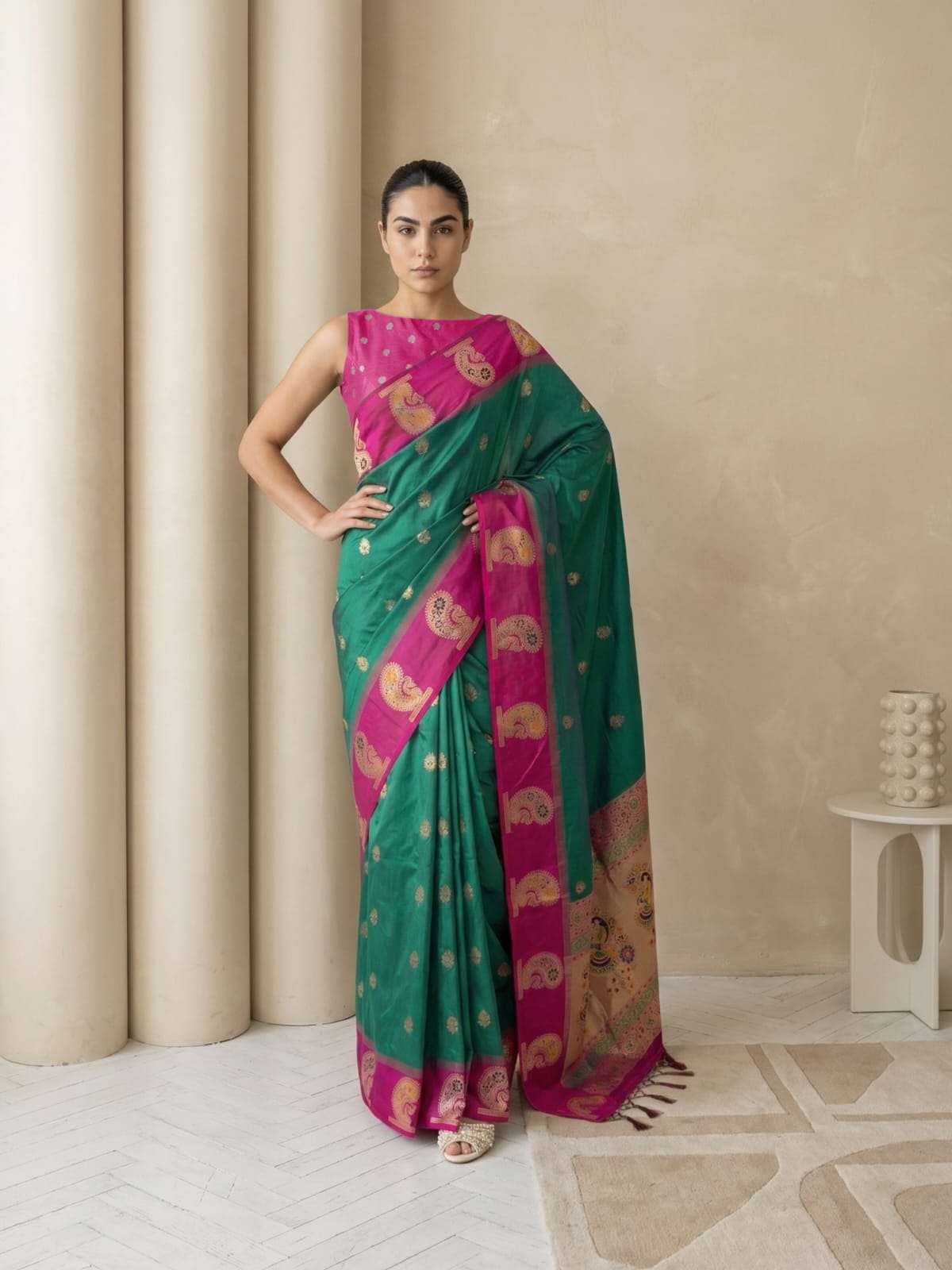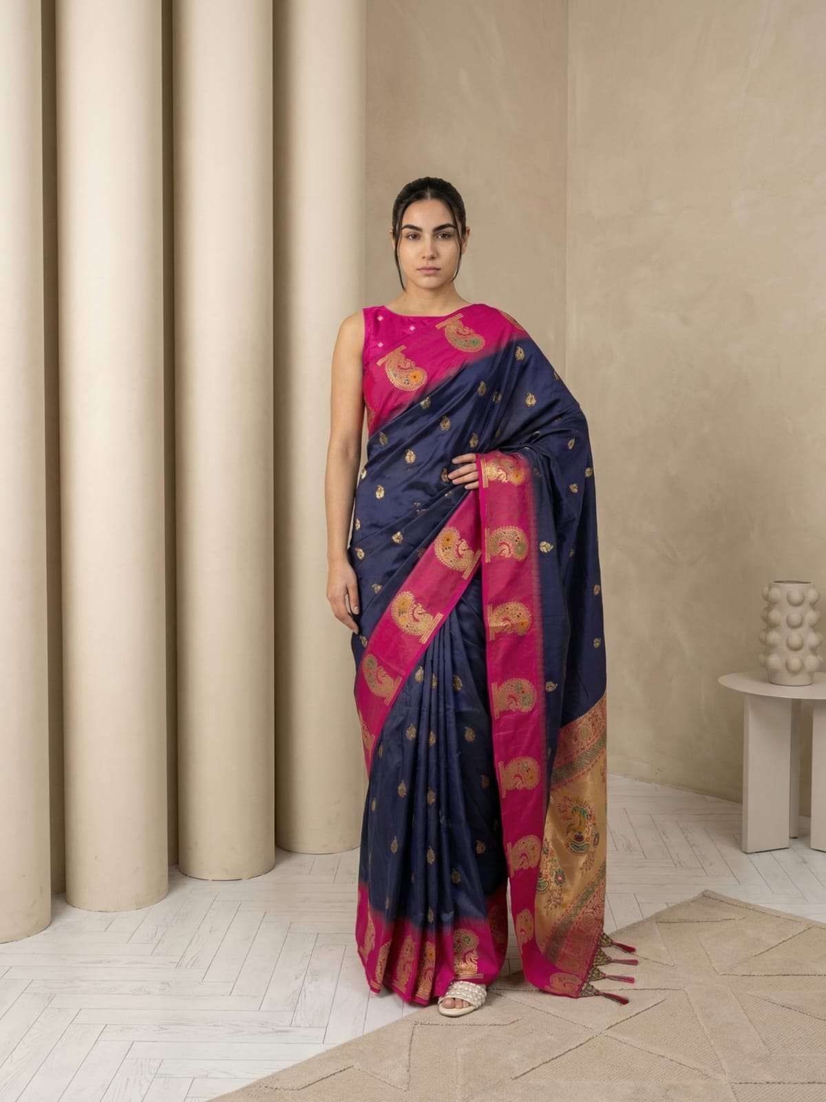 Paithani Saree with gold zari meenakari peacock motifs all over the body having contrast rich woven swan rich meenakari Peacock Paithani unique Pallu, unique meenakari peacock butta border and paired with Contrast brocade Blouse same as shown.
