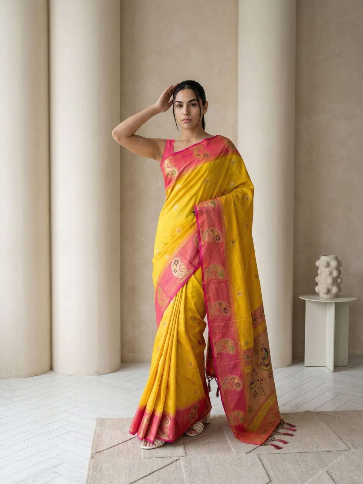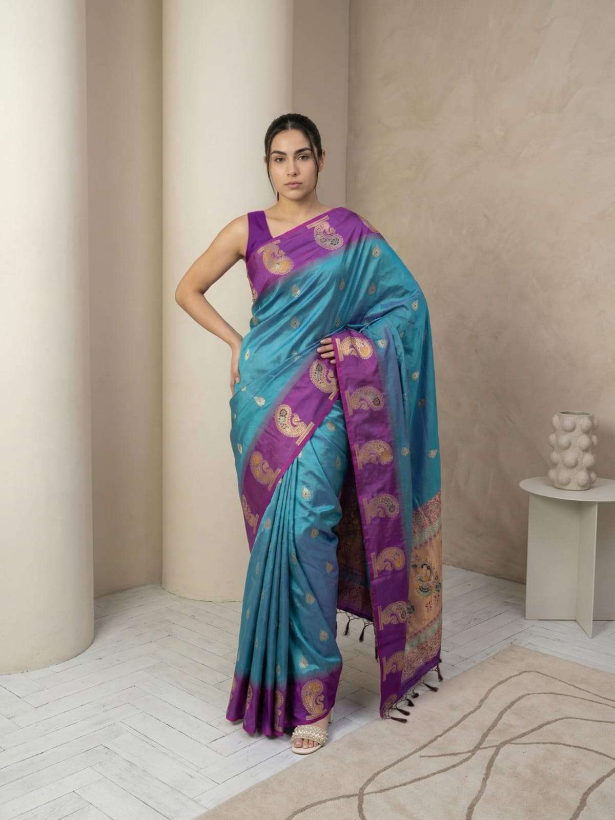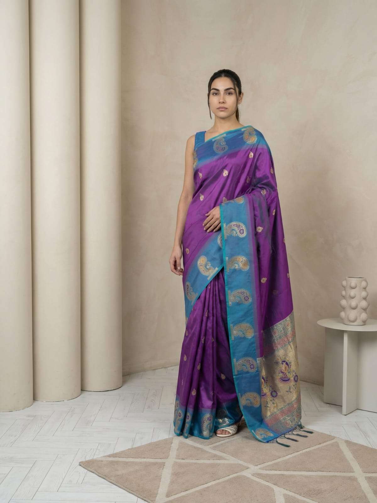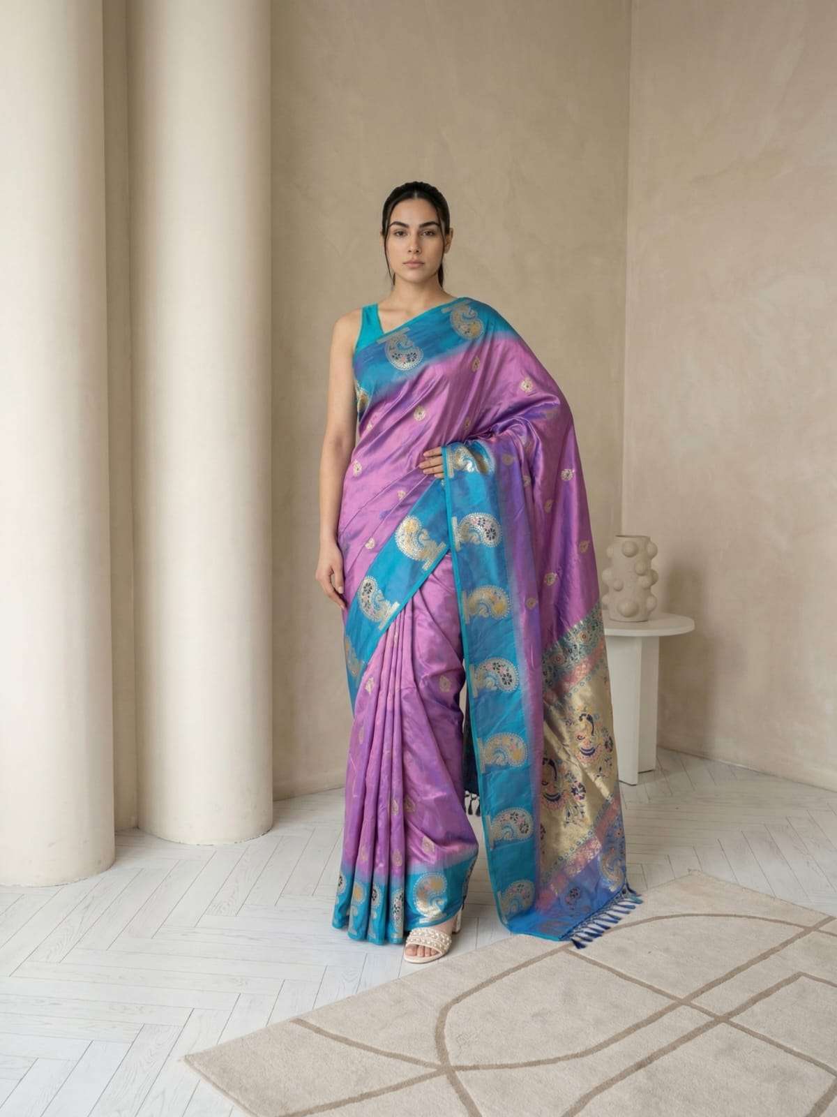 Paithani Saree with gold zari meenakari peacock motifs all over the body having contrast rich woven swan rich meenakari Peacock Paithani unique Pallu, unique meenakari peacock butta border and paired with Contrast brocade Blouse same as shown.